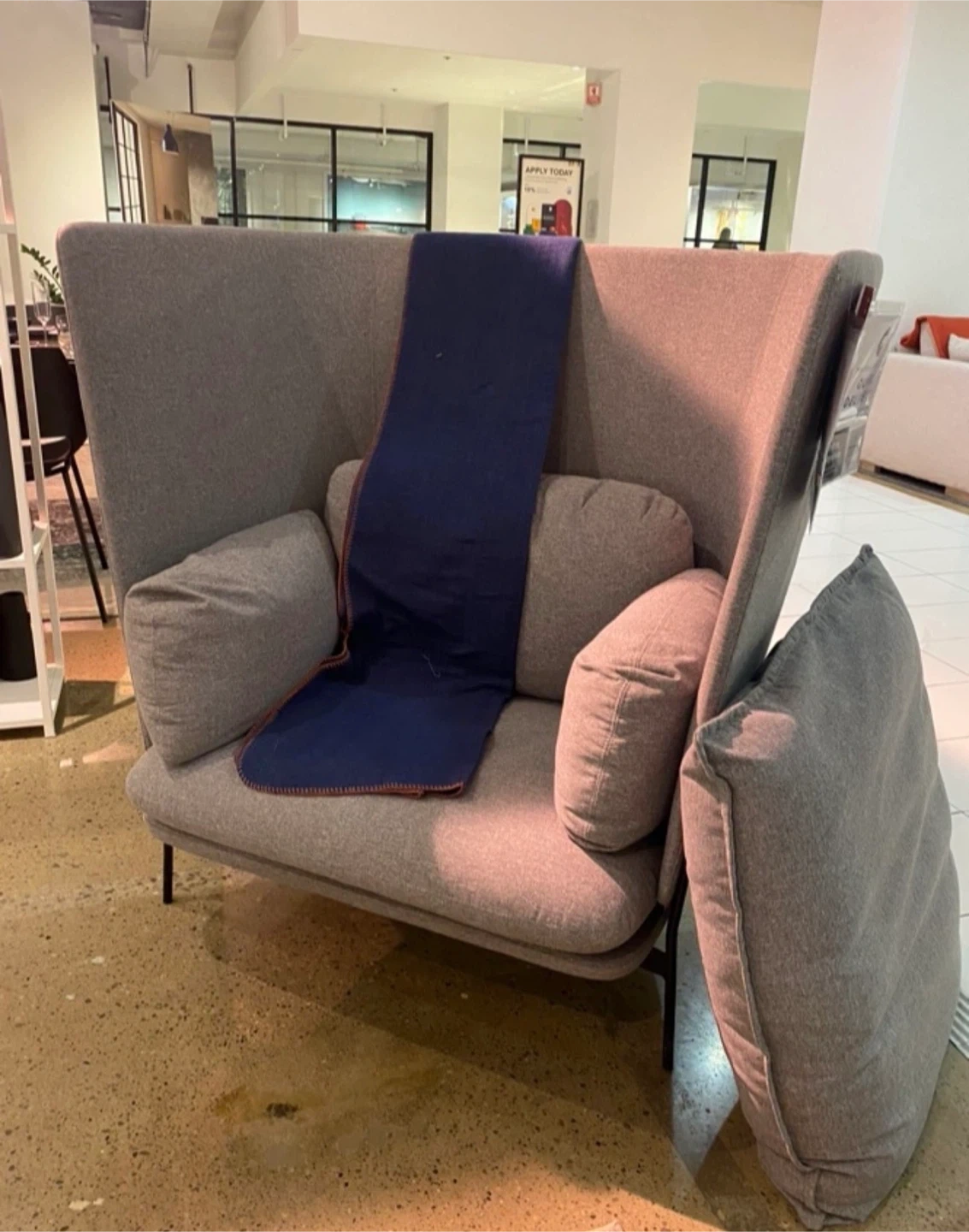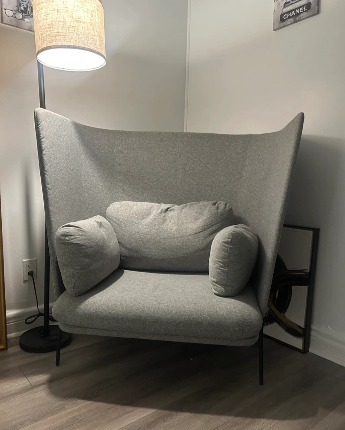Selling a comfortable Article Embrace armchair in a neutral grey colour. It's in great condition and would be a lovely addition to any living space. It features a high back and supportive armrests, perfect for relaxing with a good book or watching a movie. The chair is made with quality materials and has a modern design.