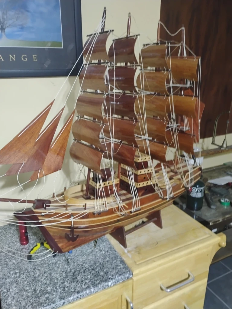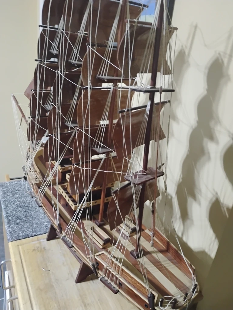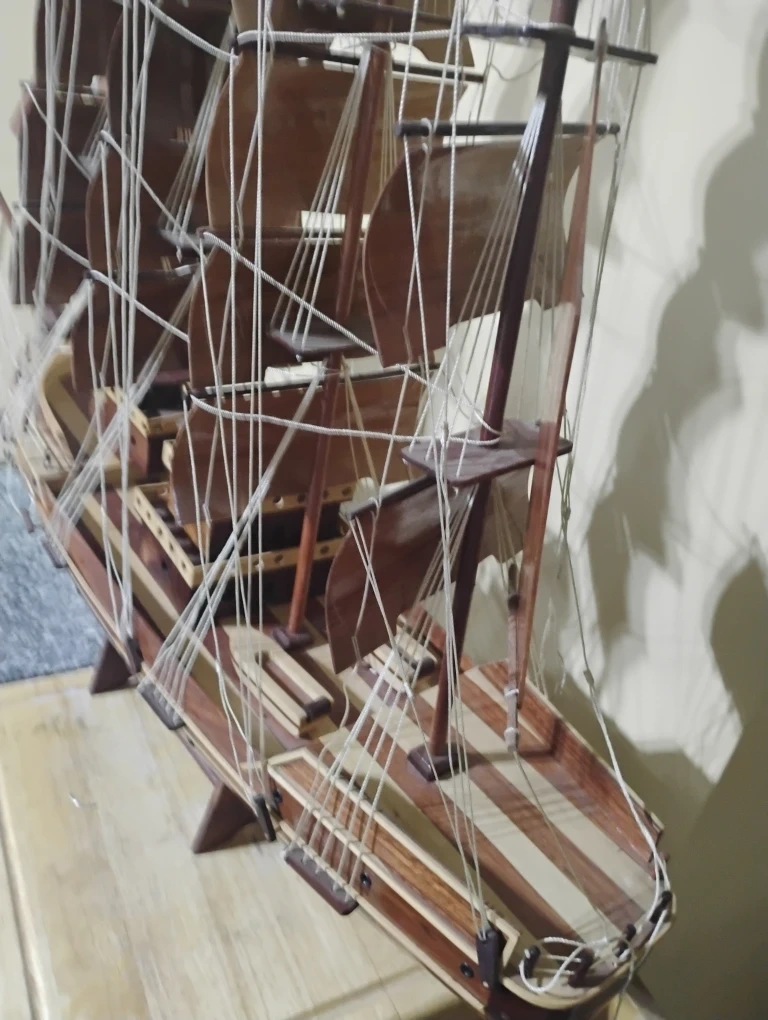 Here's a beautiful wooden ship model, perfect for adding a nautical touch to your home or office! It's in great condition and would make a lovely decorative piece