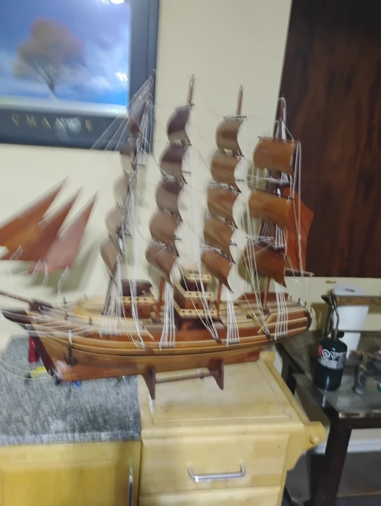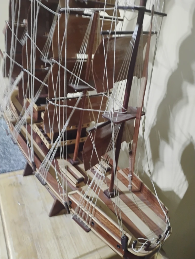 Here's a beautiful wooden ship model, perfect for adding a nautical touch to your home or office! It's in great condition and would make a lovely decorative piece