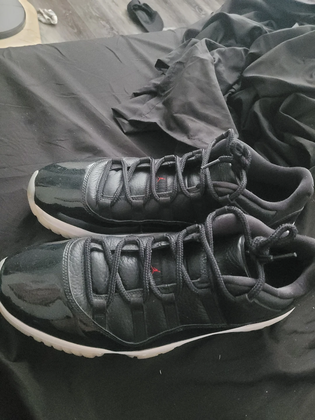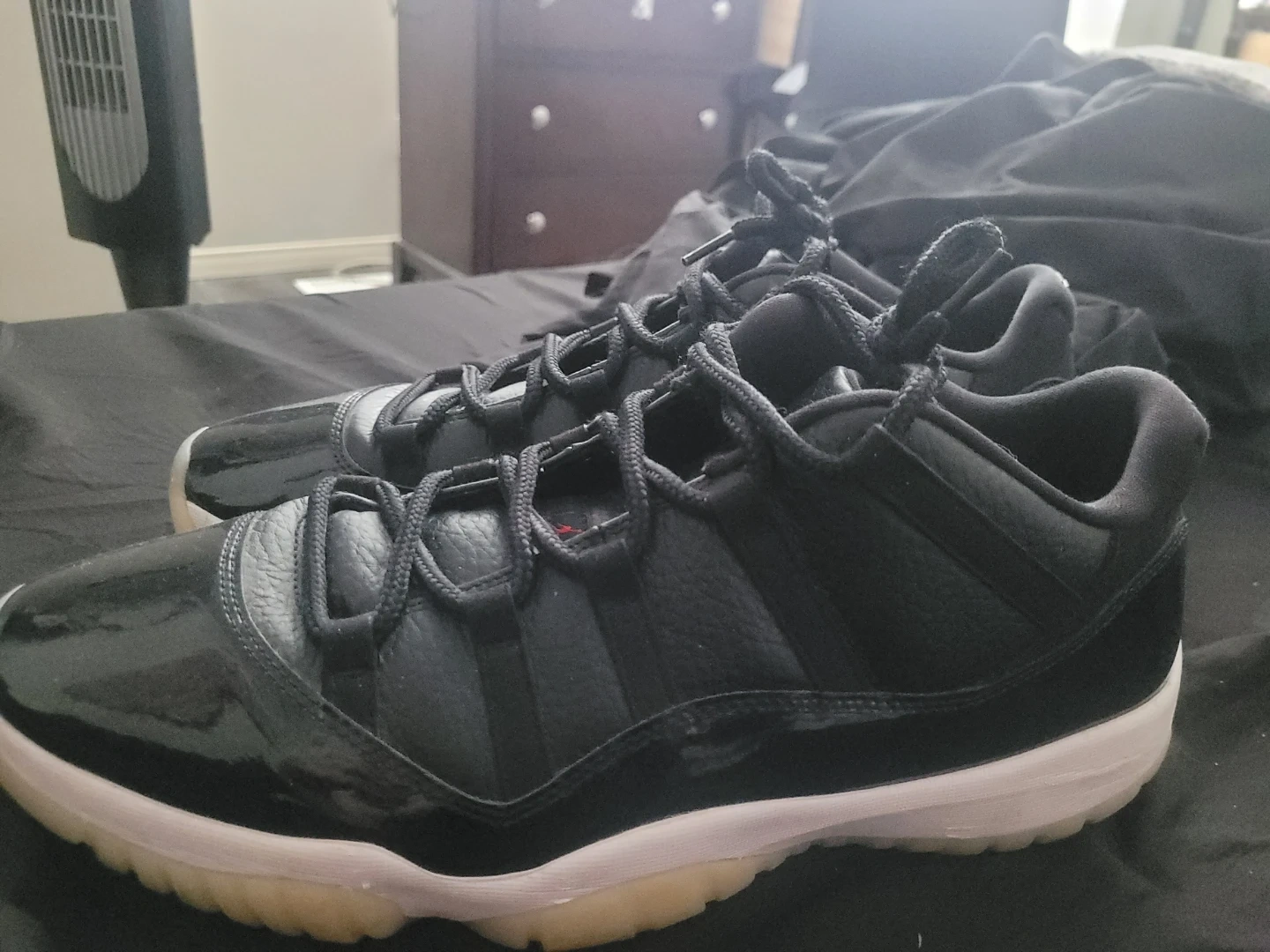 Classic black and red Air Jordan 11 Retro sneakers. These iconic kicks feature a patent leather mudguard and a durable rubber sole. Perfect for everyday wear or stepping out in style!