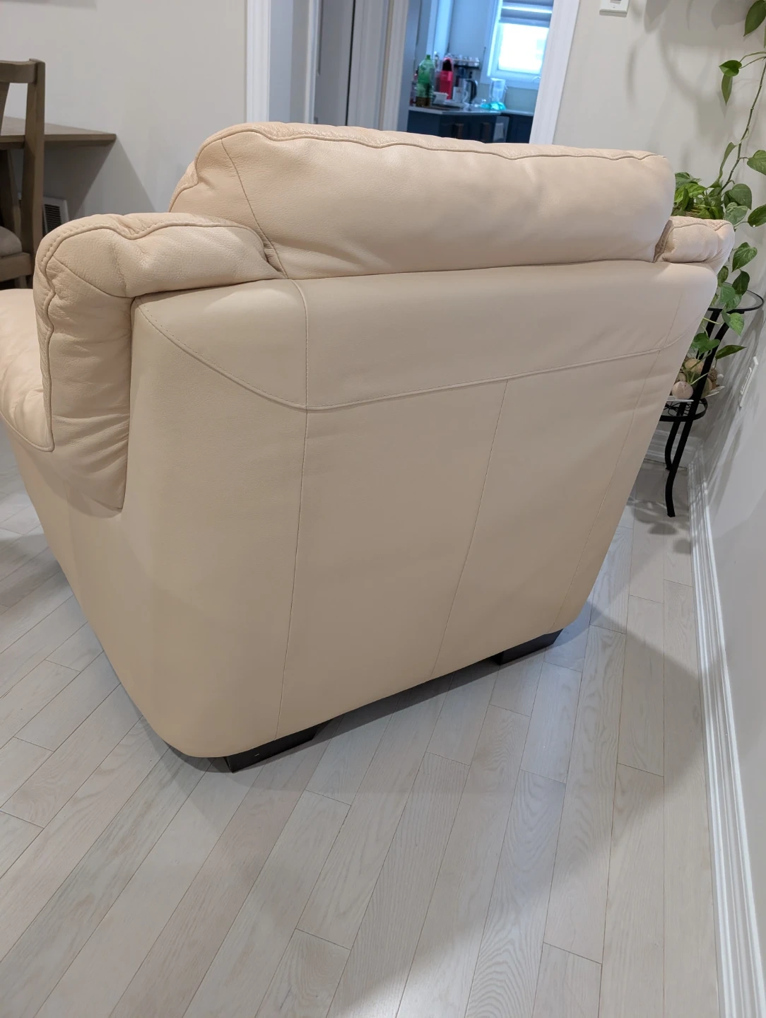 Selling a comfortable cream-coloured leather sofa and armchair set. It's in great condition and would be a lovely addition to any living room. The material is soft and durable, perfect for relaxing after a long day