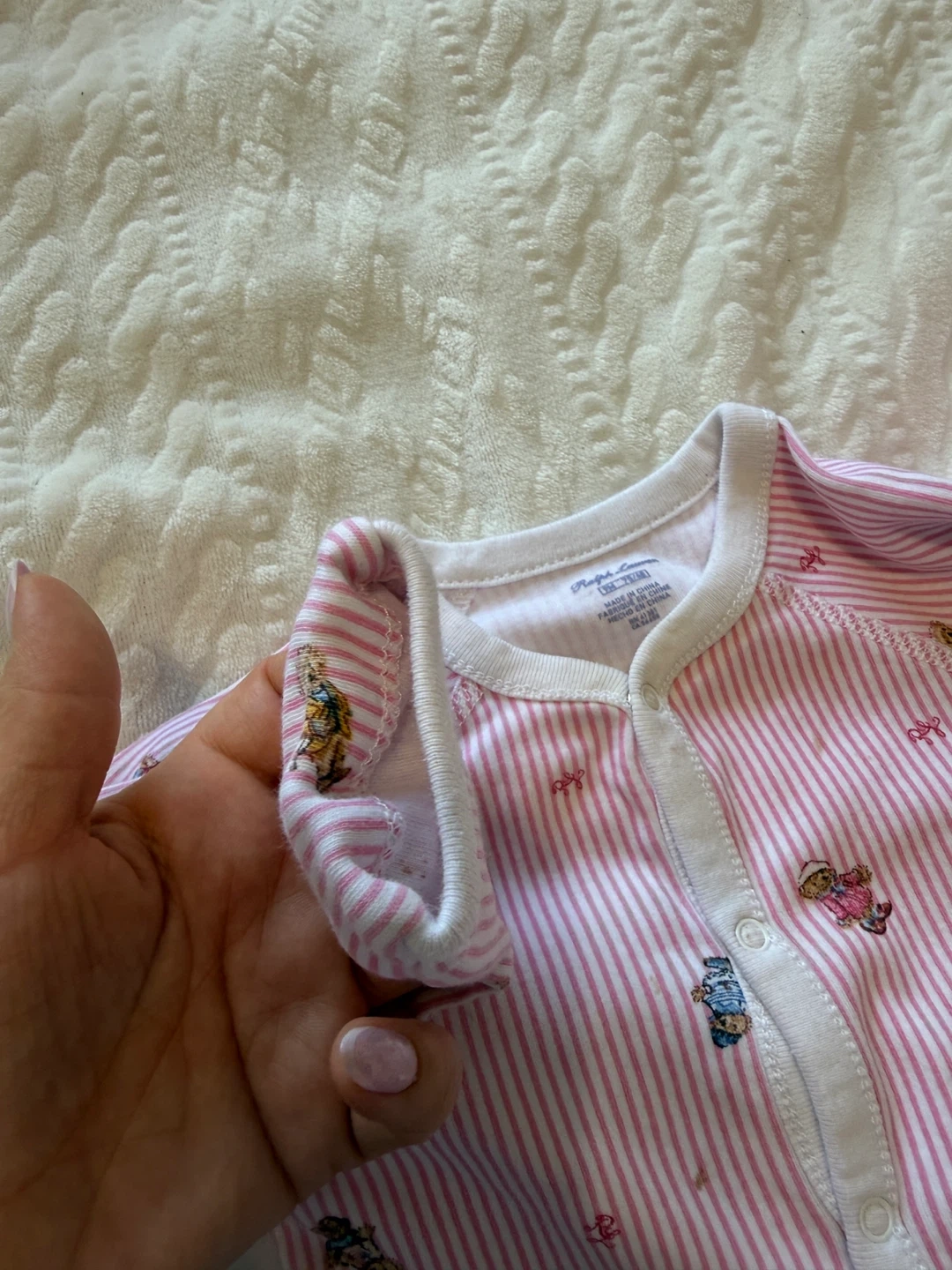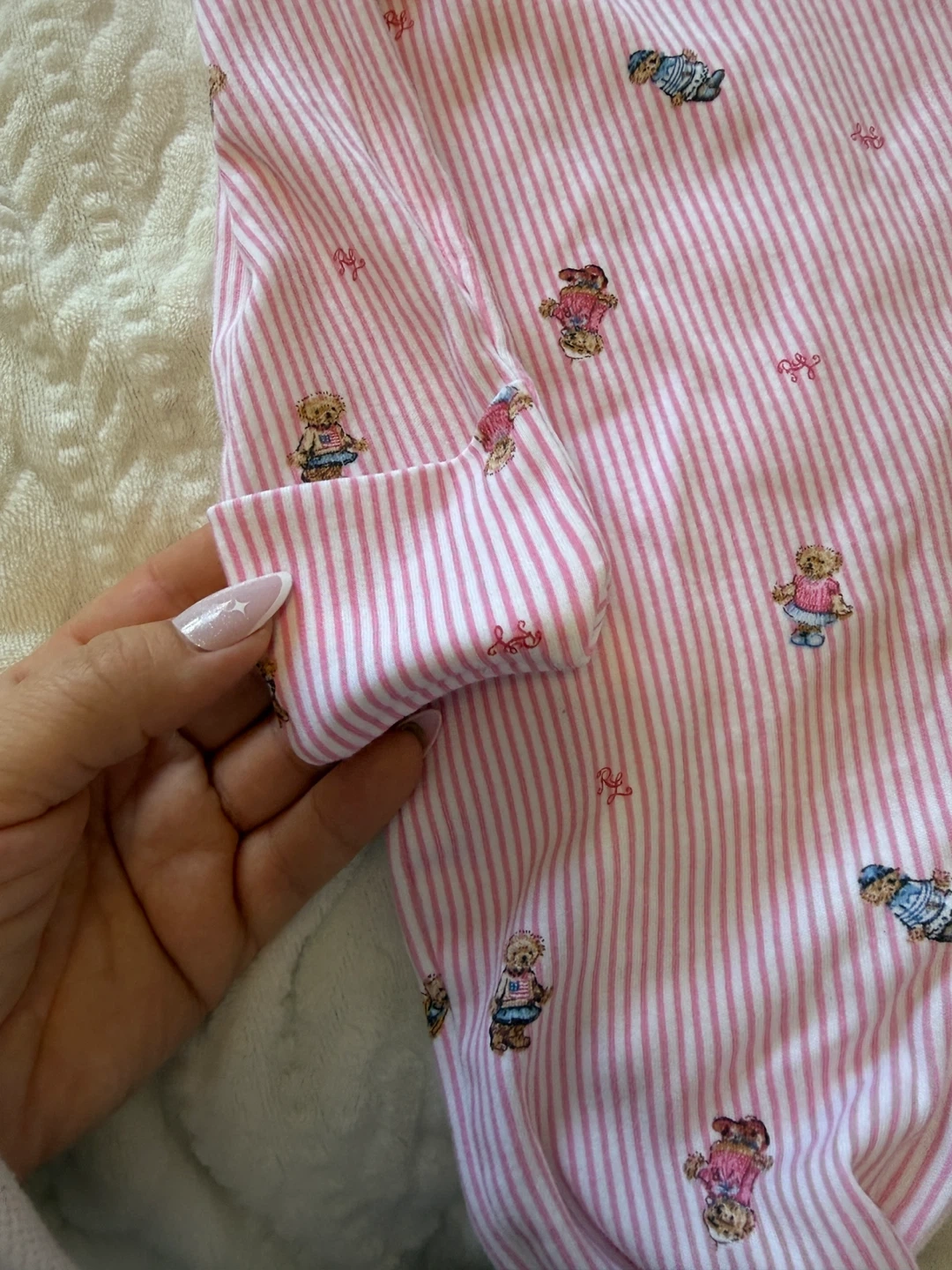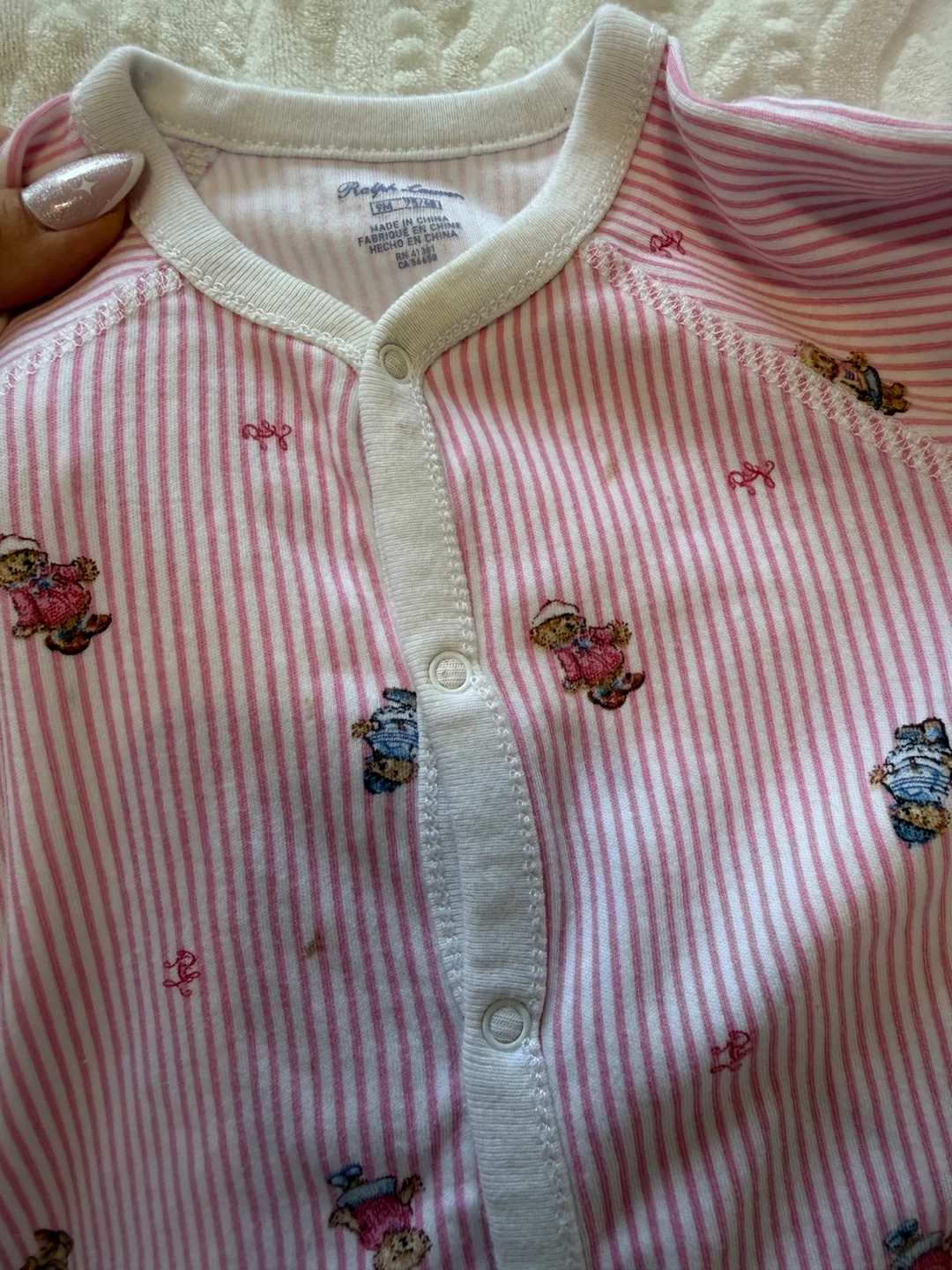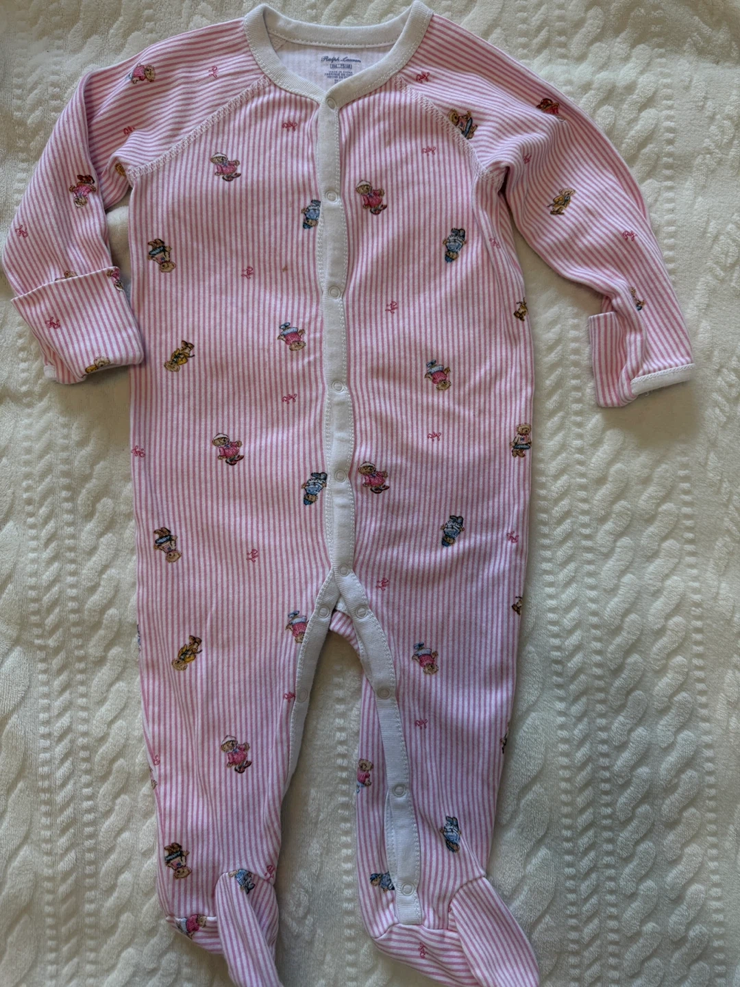 A cute Ralph Lauren baby onesie in size 9M. It features a pink and white striped pattern with adorable teddy bear designs. There are some signs of wear, but it's still in good condition for your little one