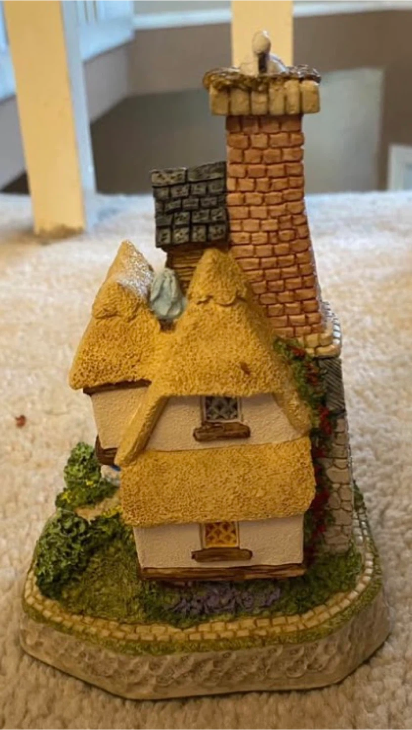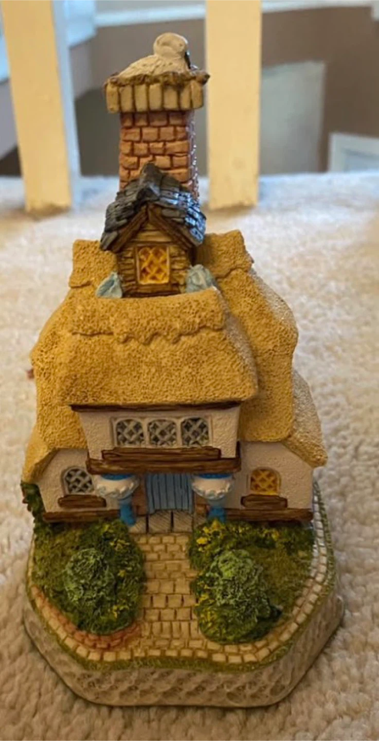 A charming David Winter Cottages "Stork Cottage (Boy)" figurine. Hand made and hand painted in Great Britain. This decorative piece displays a thatched roof cottage with a brick chimney and floral accents.
