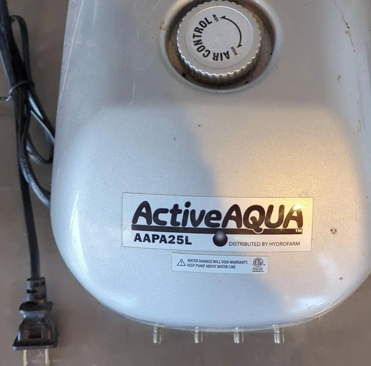 This is an ActiveAqua AAPA25L air pump. It features adjustable air control. Suitable for aquariums and hydroponics systems. Excellent for deep water culture.