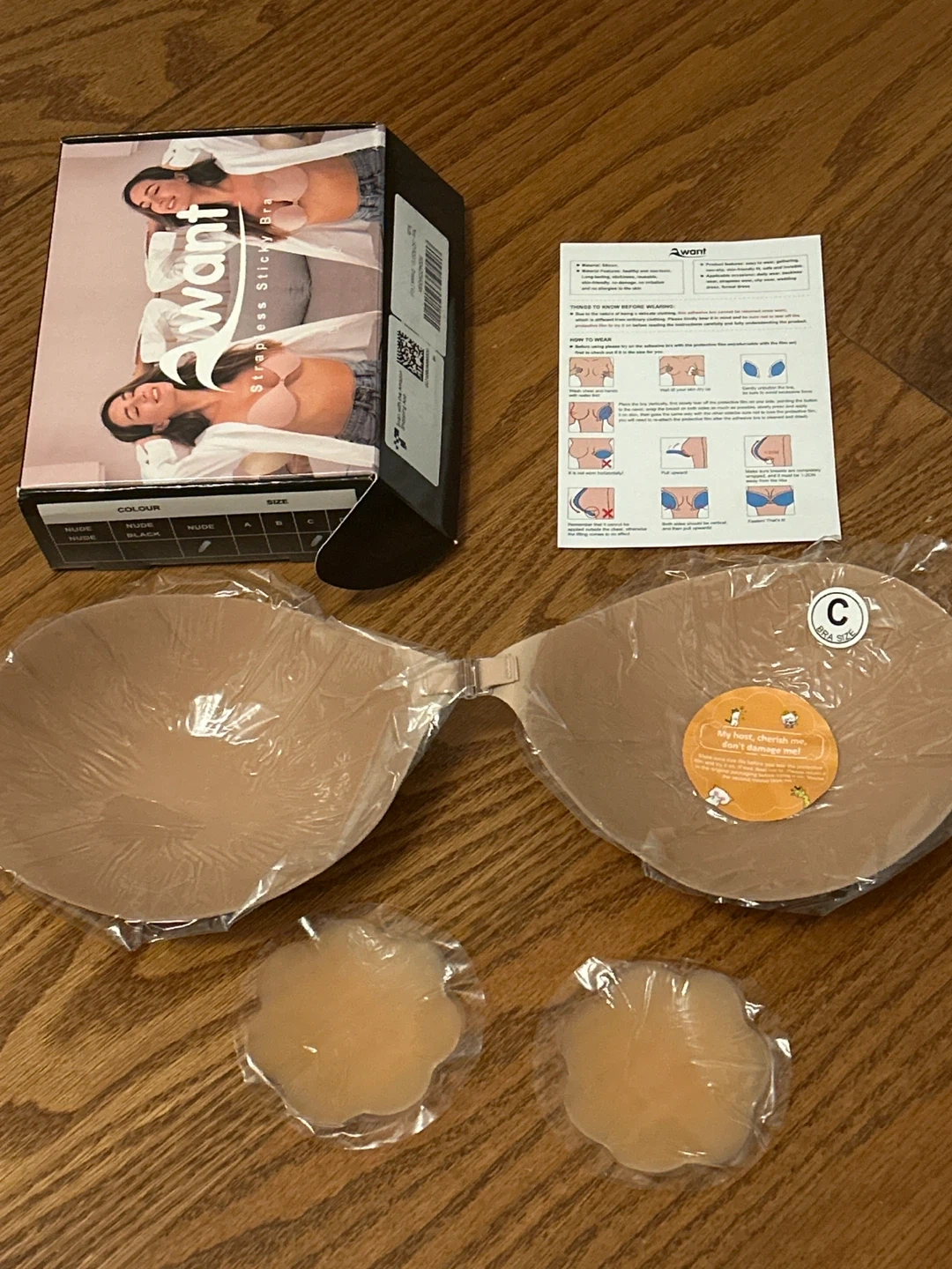 This is a size C strapless sticky bra in nude. It's made of silicone and comes with nipple covers. Instructions for use are included.
