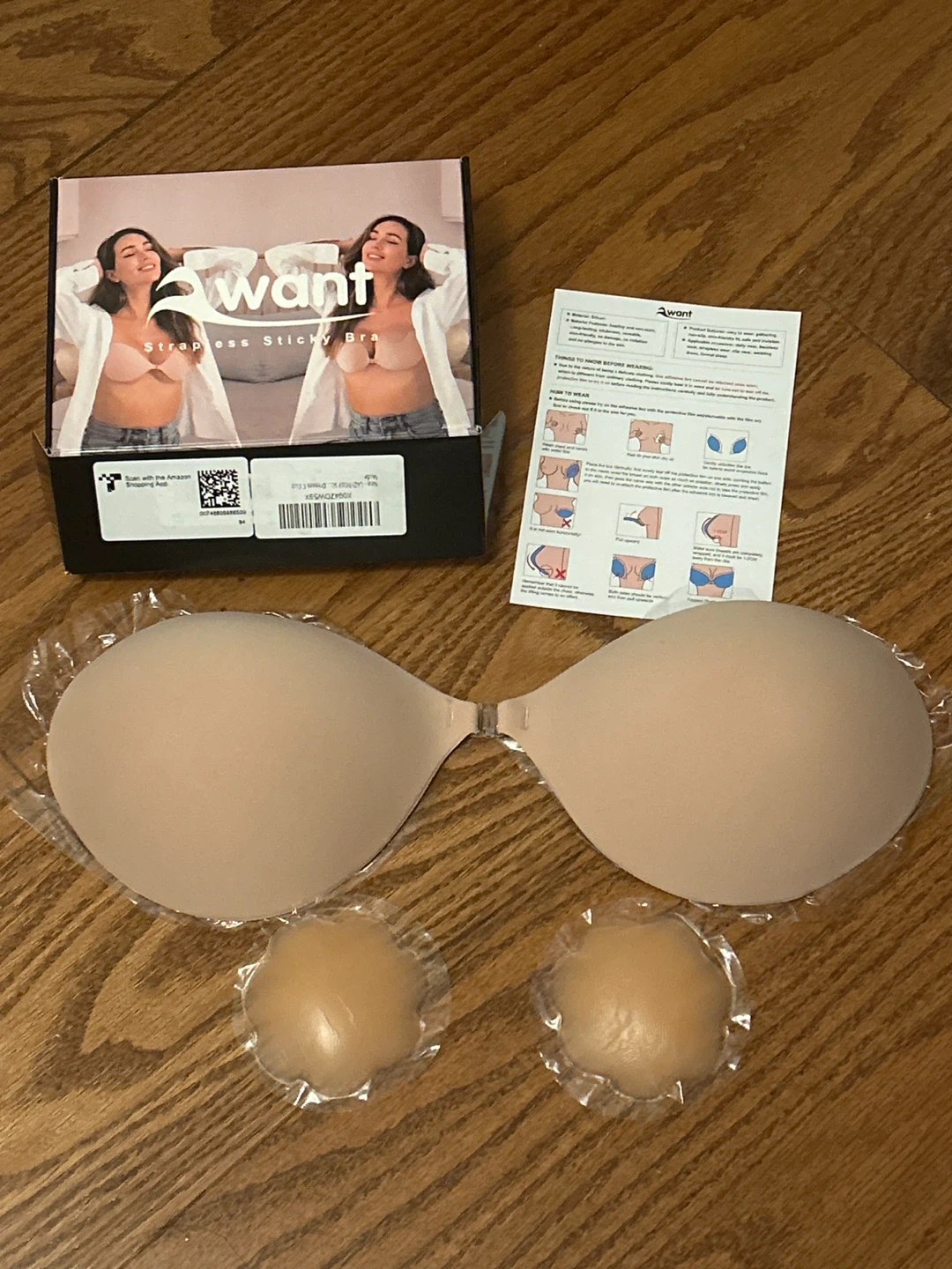 This is a size C strapless sticky bra in nude. It's made of silicone and comes with nipple covers. Instructions for use are included.