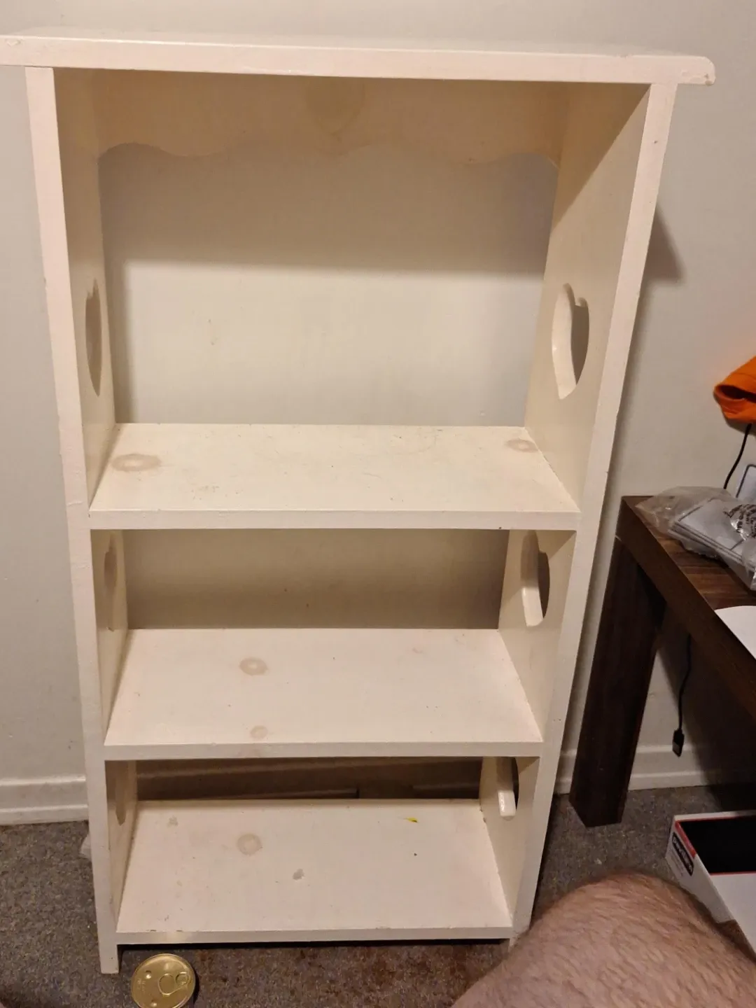 Selling a cute wooden shelf! It has three shelves and heart cutouts on the sides. There are some water stains on the shelves, as pictured. Perfect for a kid's room or any room that needs a little extra storage and charm