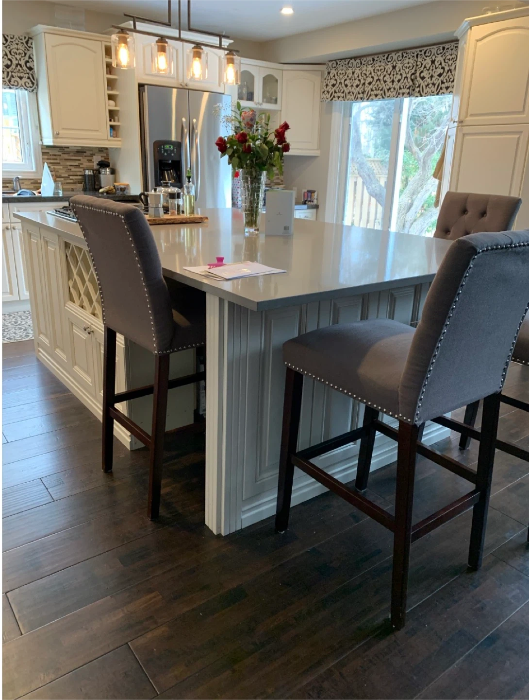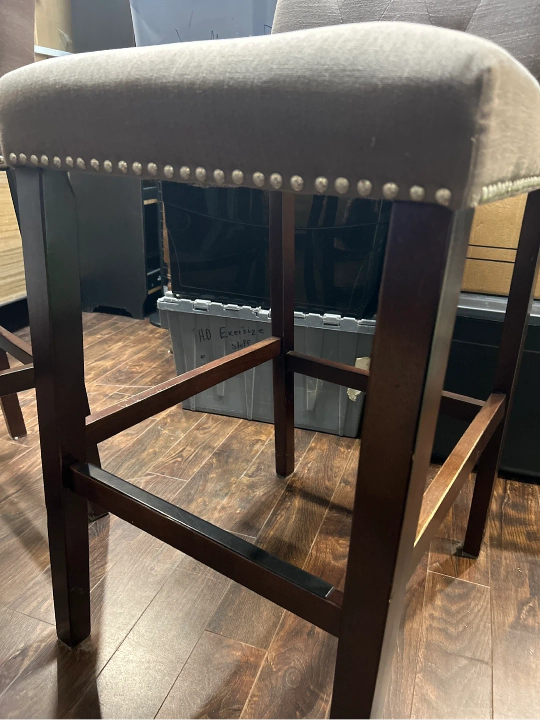 4 Island seats , tufted back design with nailhead trim and a dark wood frame. Quality, comfortable and stylish seating for your kitchen island or bar area! Seats may need a quick steam clean from storage otherwise in great shape . Priced to sell $135 each