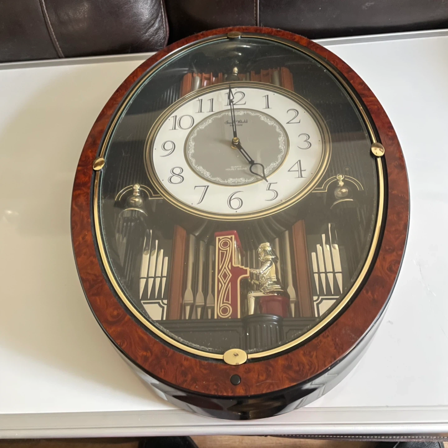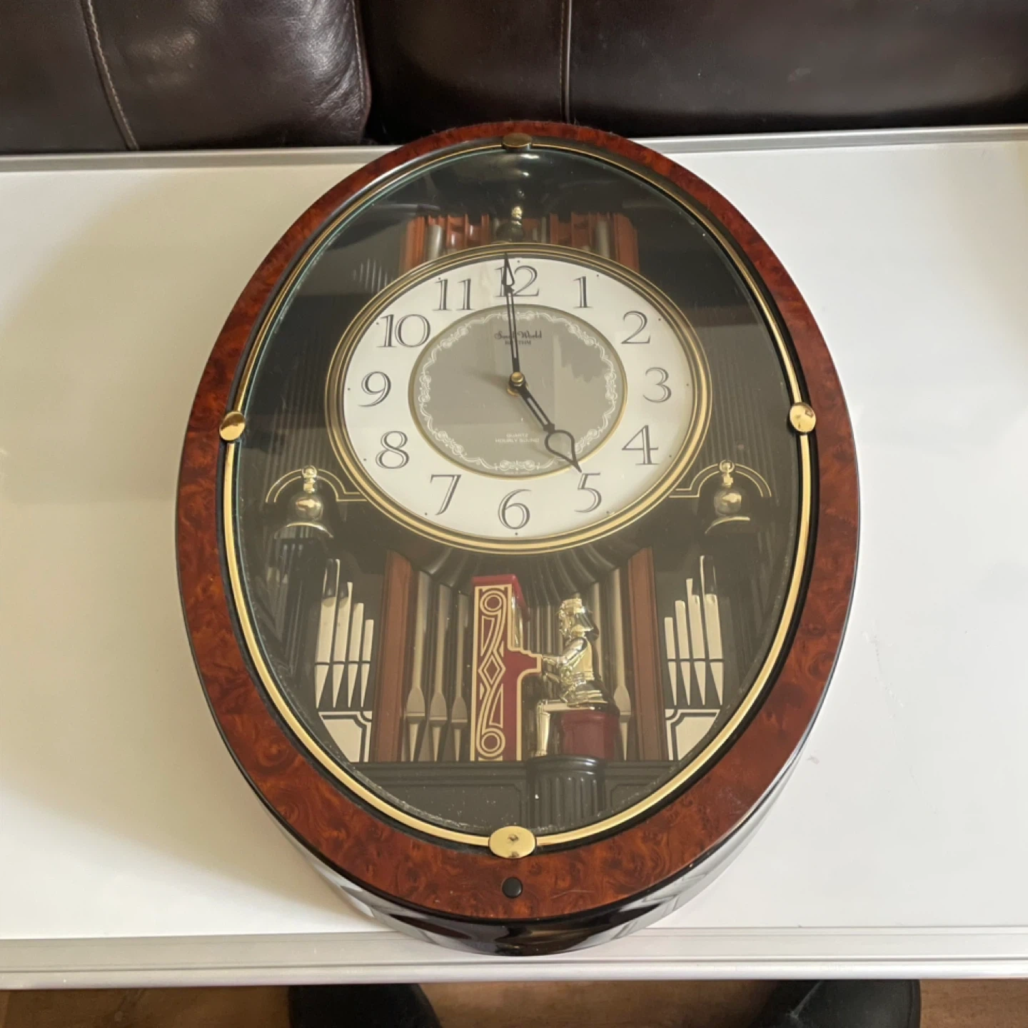 Needs slight repair where battery goes. Beautiful clock. Seth Thomas wall clock with Westminster chimes. Features a dark wood-tone oval frame with a glass cover. It has a quartz movement and plays hourly.