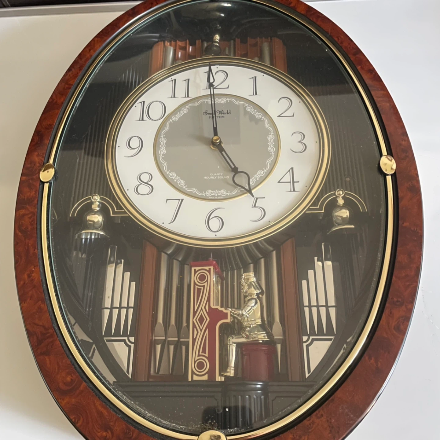 Needs slight repair where battery goes. Beautiful clock. Seth Thomas wall clock with Westminster chimes. Features a dark wood-tone oval frame with a glass cover. It has a quartz movement and plays hourly.