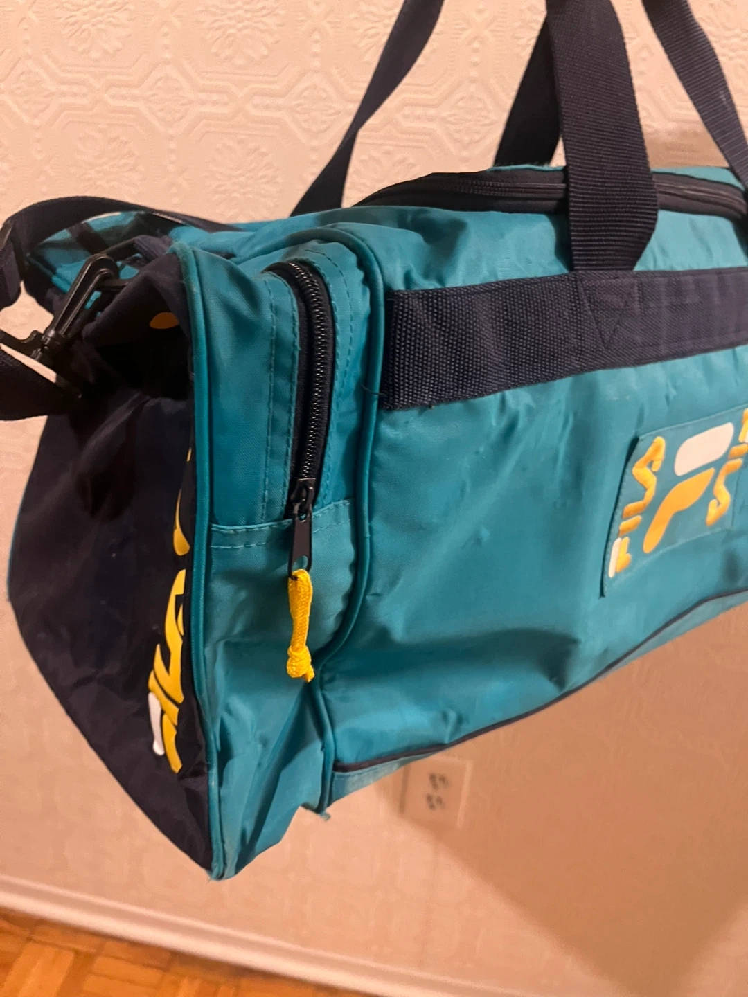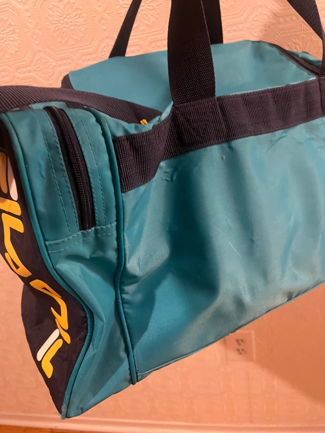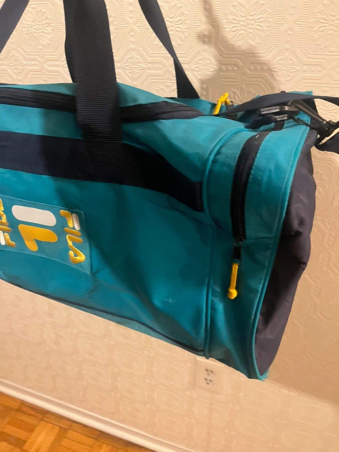 Here's a Fila duffle bag in teal and navy blue! It's perfect for the gym or a weekend getaway. It has a zipper closure and the Fila logo on the side