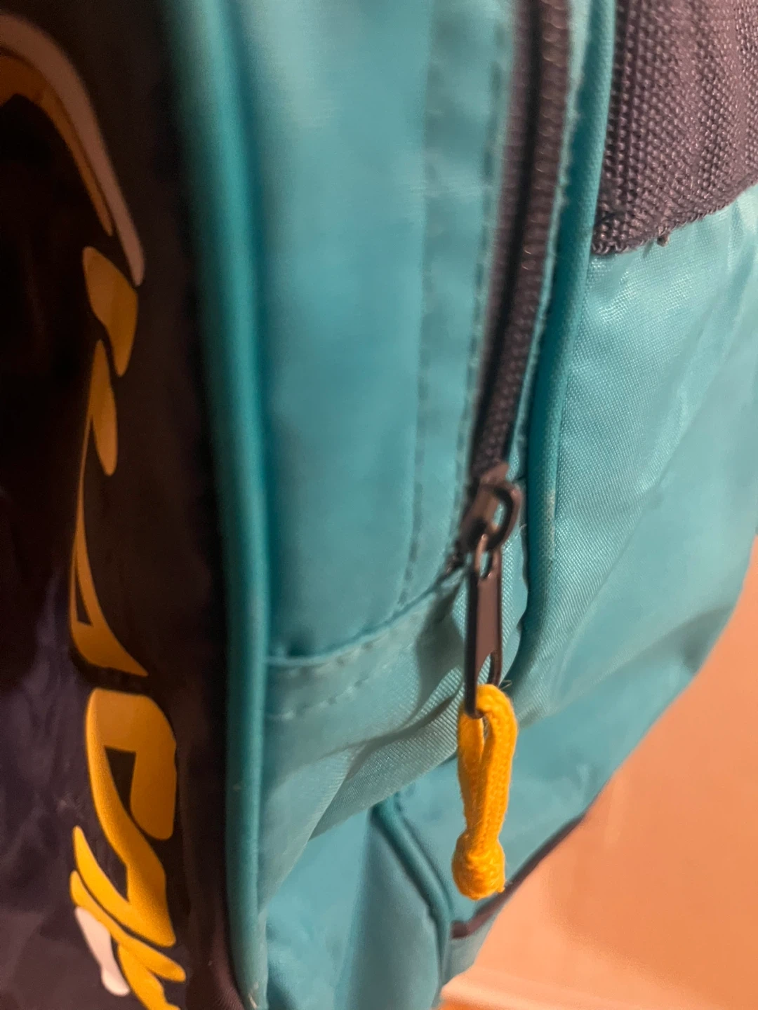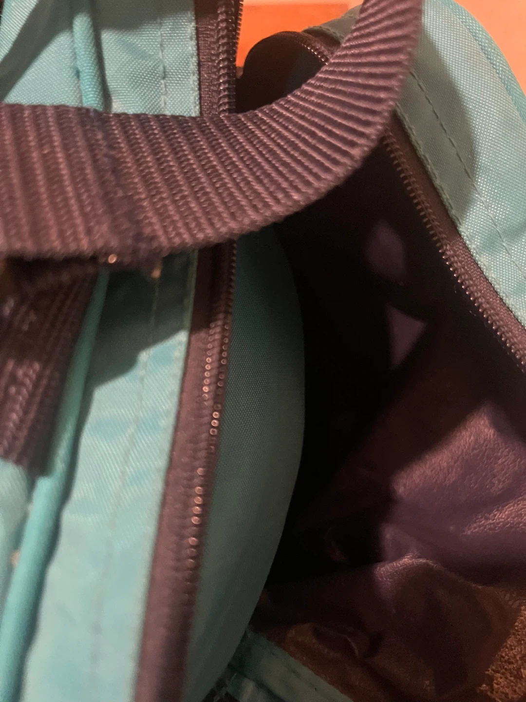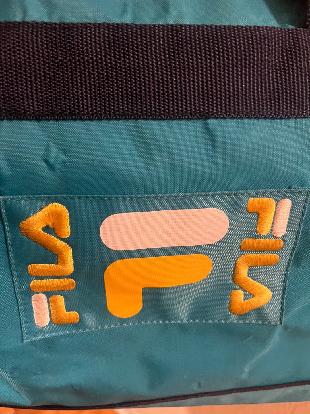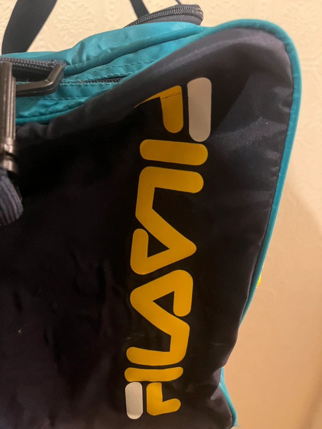 Here's a Fila duffle bag in teal and navy blue! It's perfect for the gym or a weekend getaway. It has a zipper closure and the Fila logo on the side