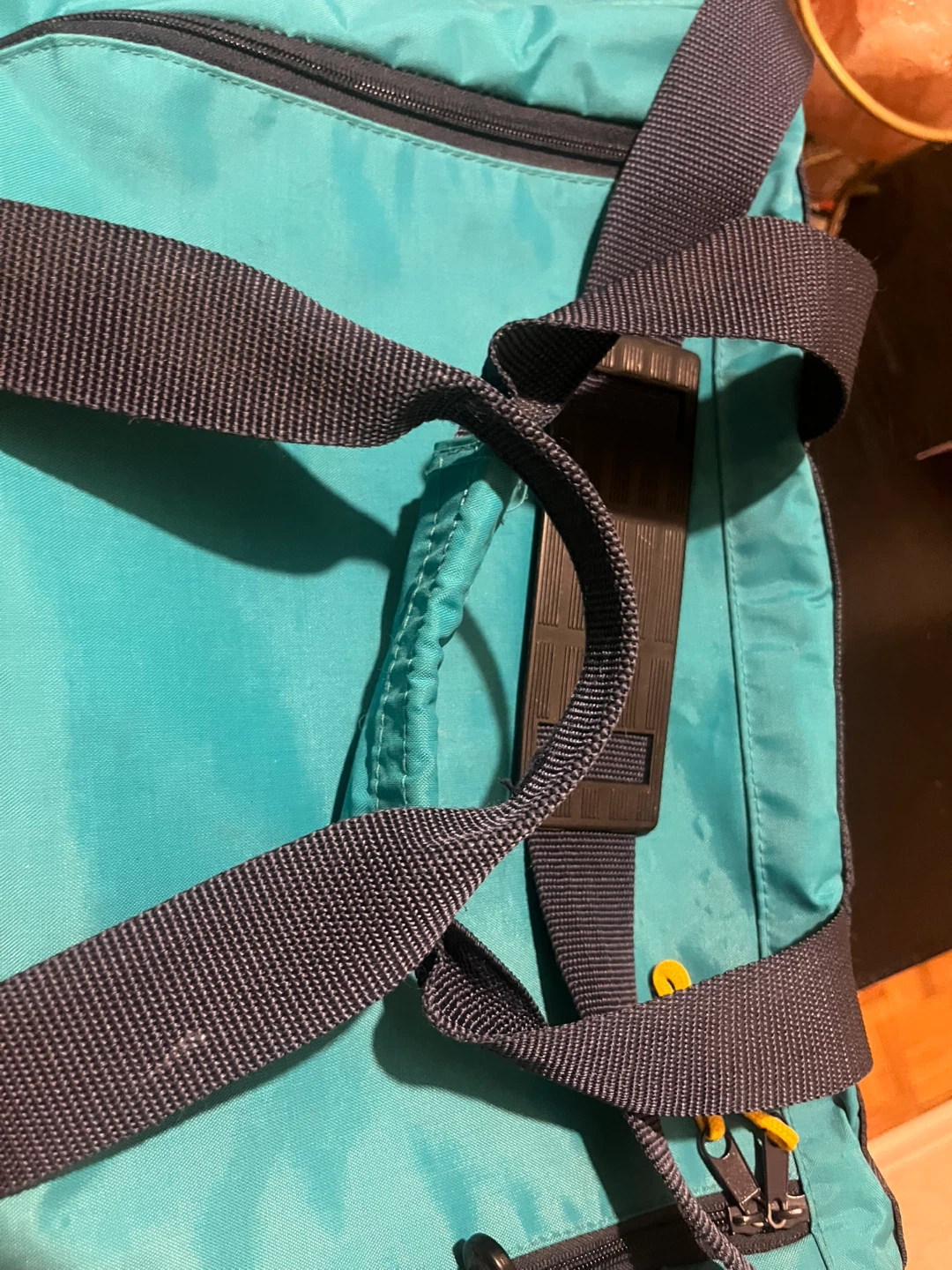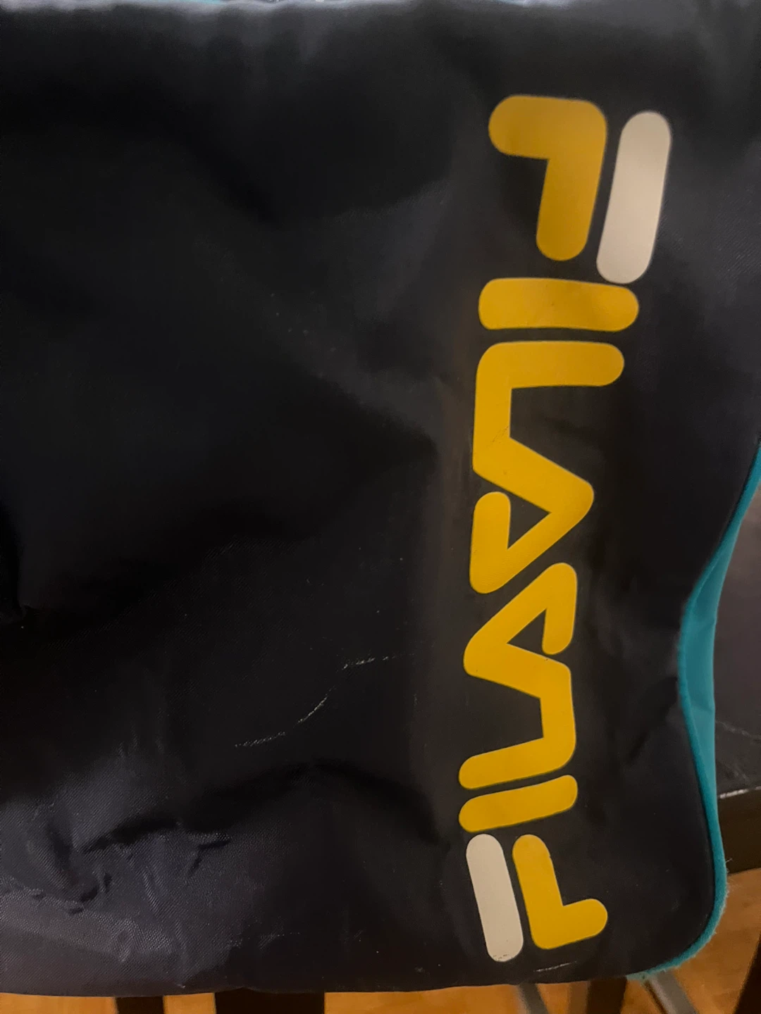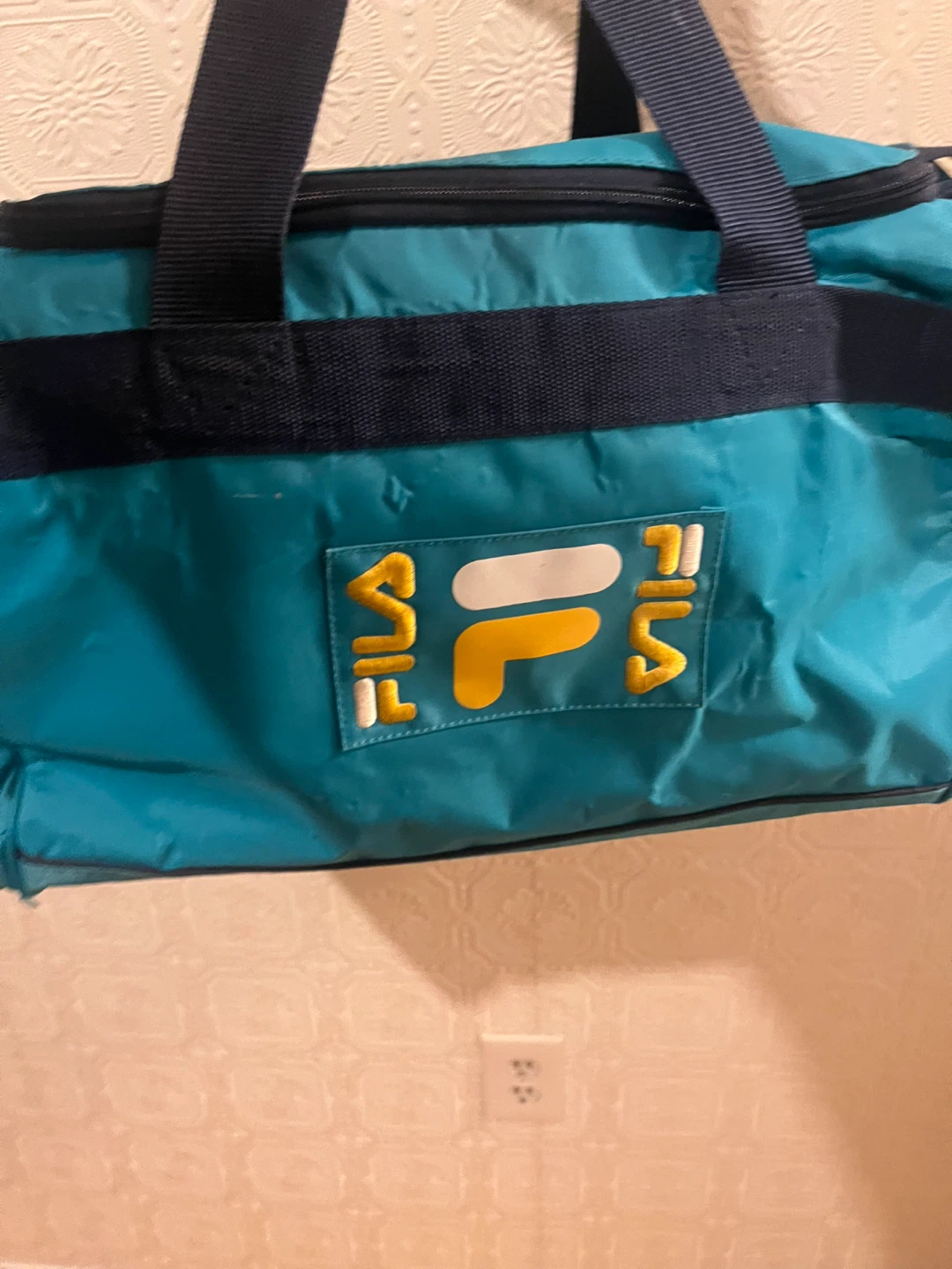Here's a Fila duffle bag in teal and navy blue! It's perfect for the gym or a weekend getaway. It has a zipper closure and the Fila logo on the side