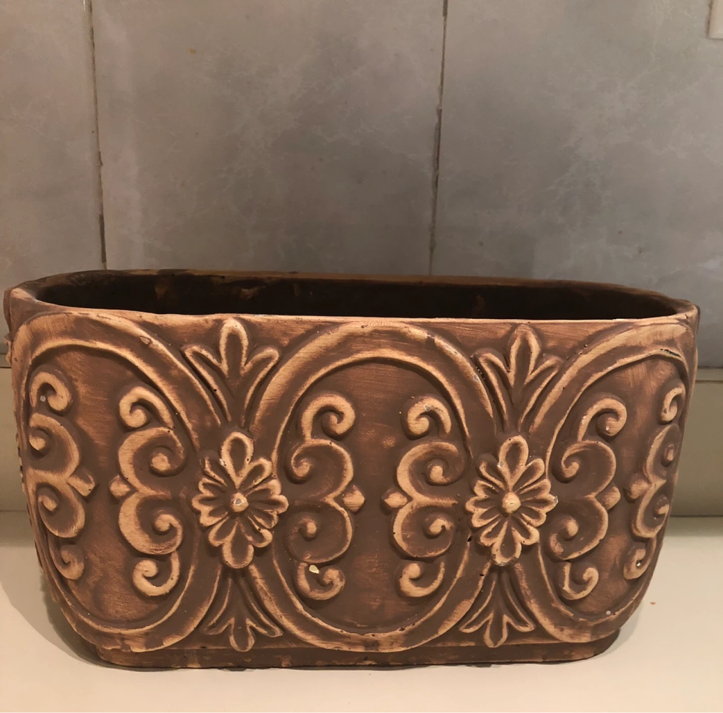 Decorative ceramic planter pot with embossed floral detailing. Made of ceramic material. Measurements in pictures