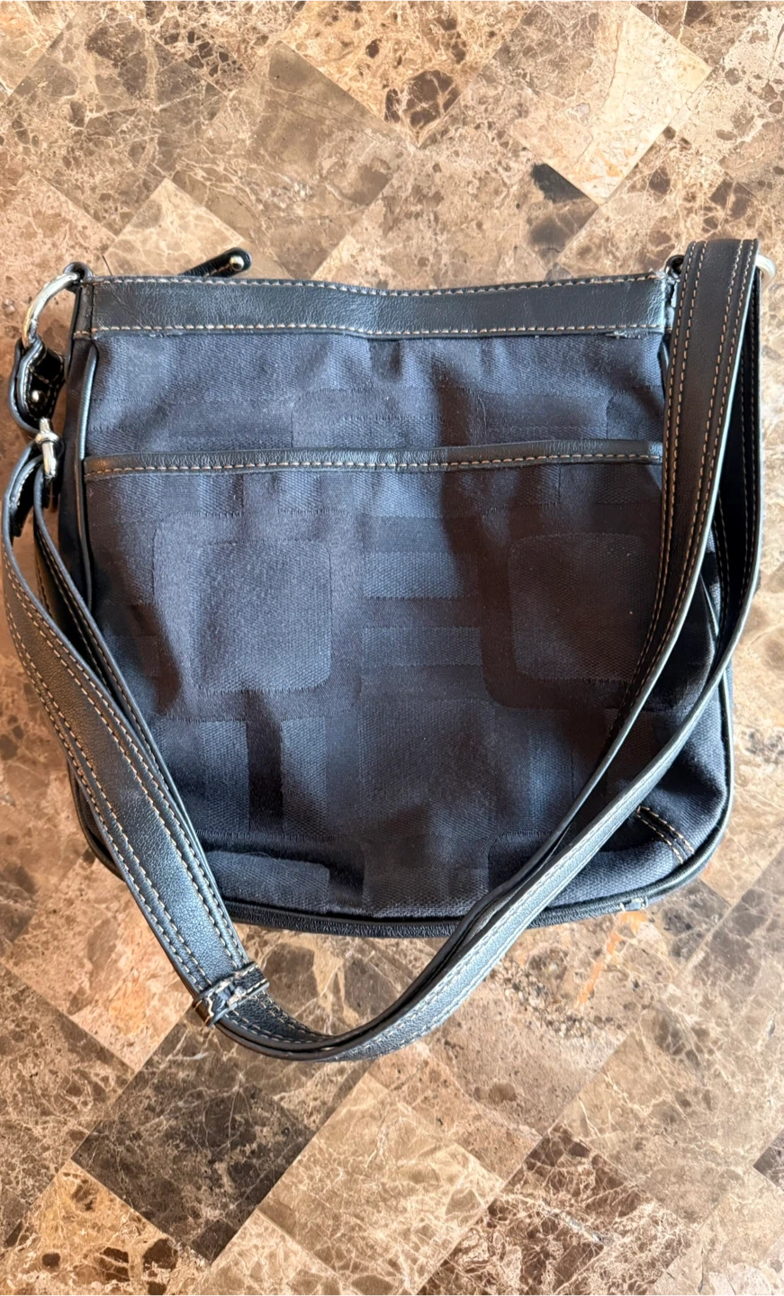 A classic black Nine West crossbody purse. It's made from durable fabric with faux leather trim. Multiple pockets inside and out offer great organization. This purse is perfect for everyday use!