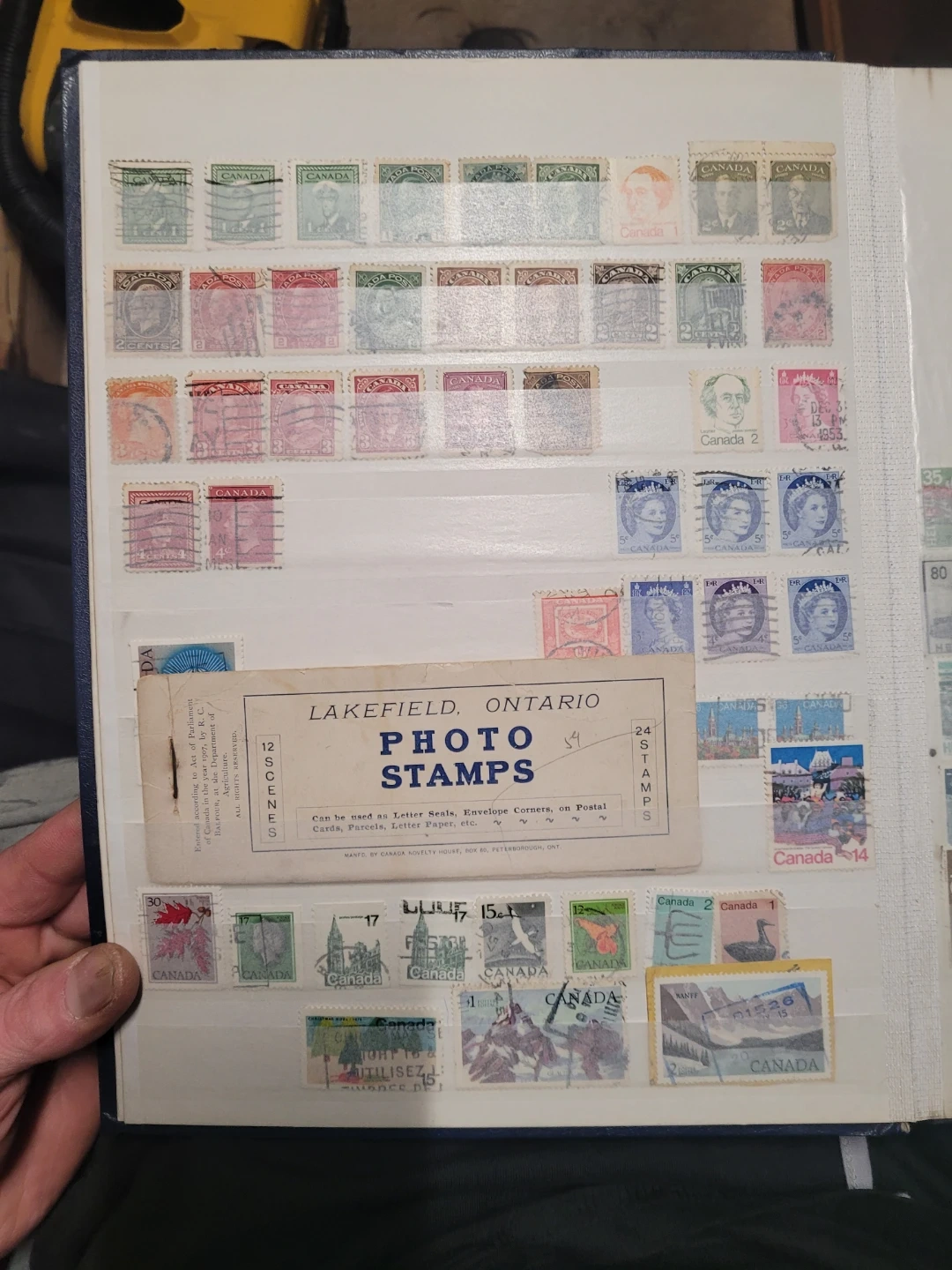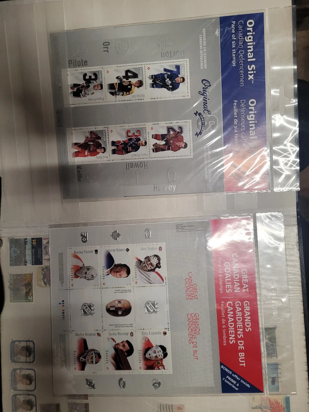 This album contains a variety of Canadian postage stamps, including historical figures, wildlife, and special editions like the 'Canadian Dino Stamps' and 'Original Six' hockey player series. It also includes stamp collectibles featuring Canadian goalies and a 'Haunted Canada' set. A 'Lakefield, Ontario Photo Stamps' sheet is also present. Message for pricing 9n individual stamps or for a package deal