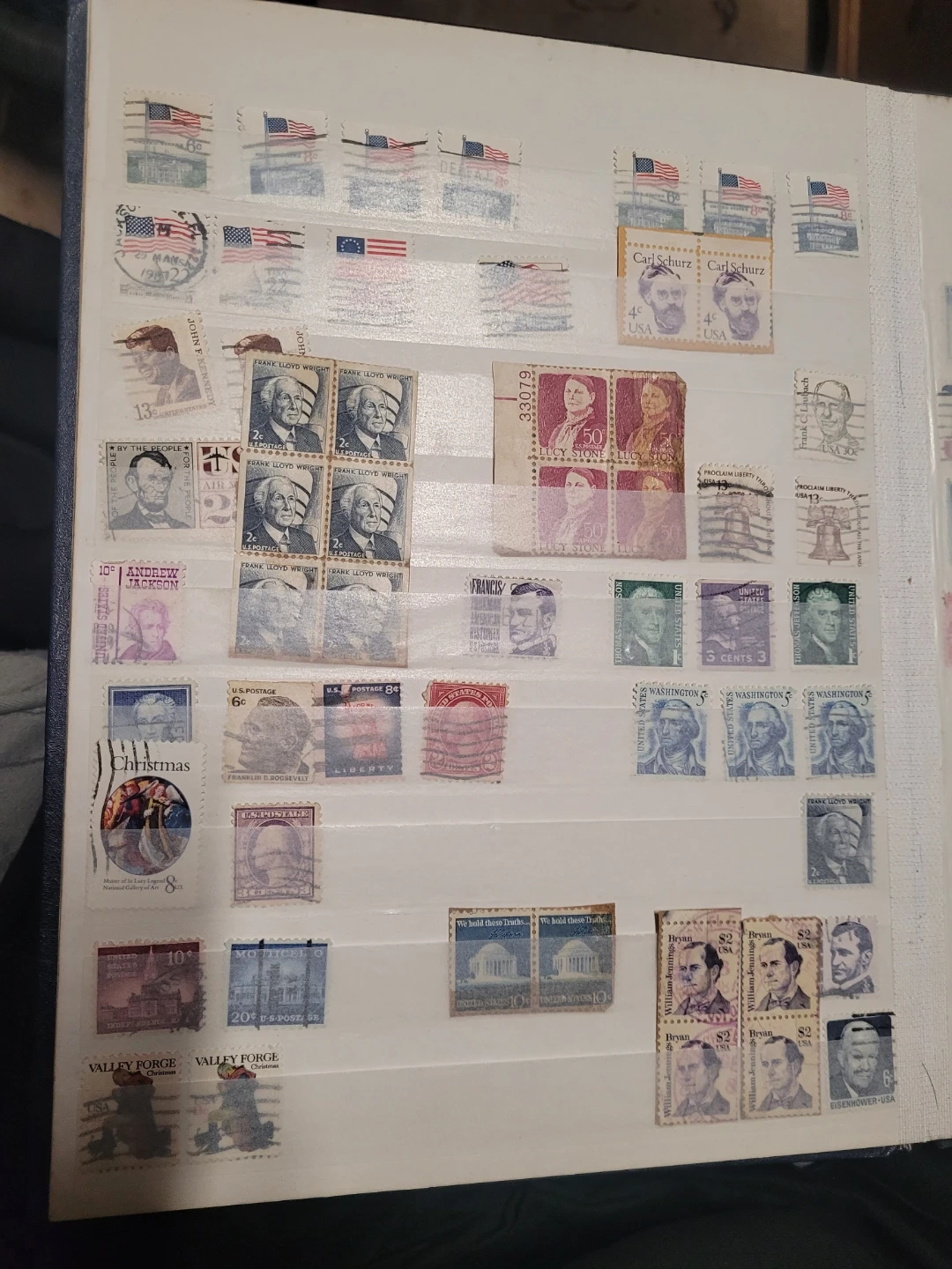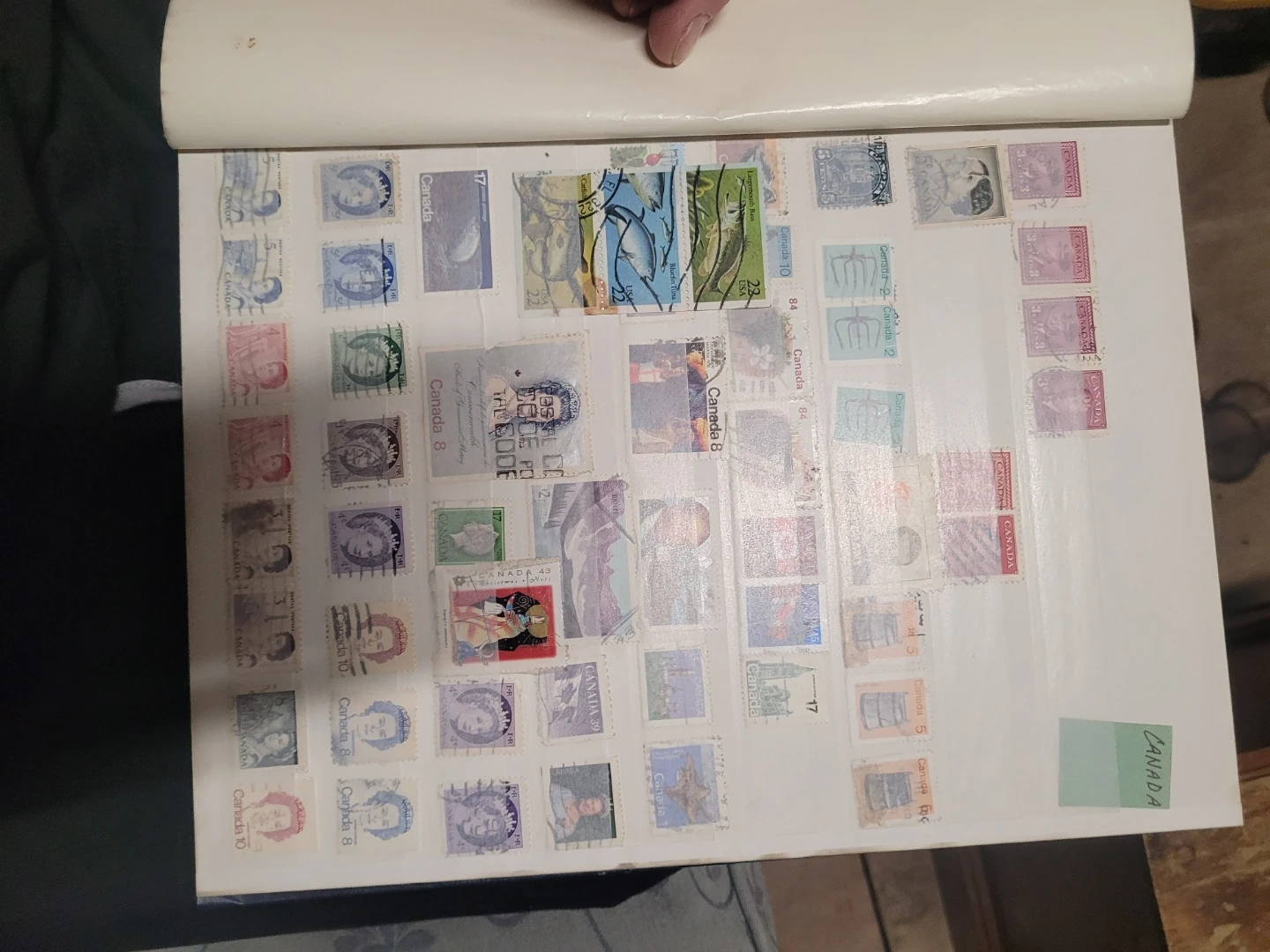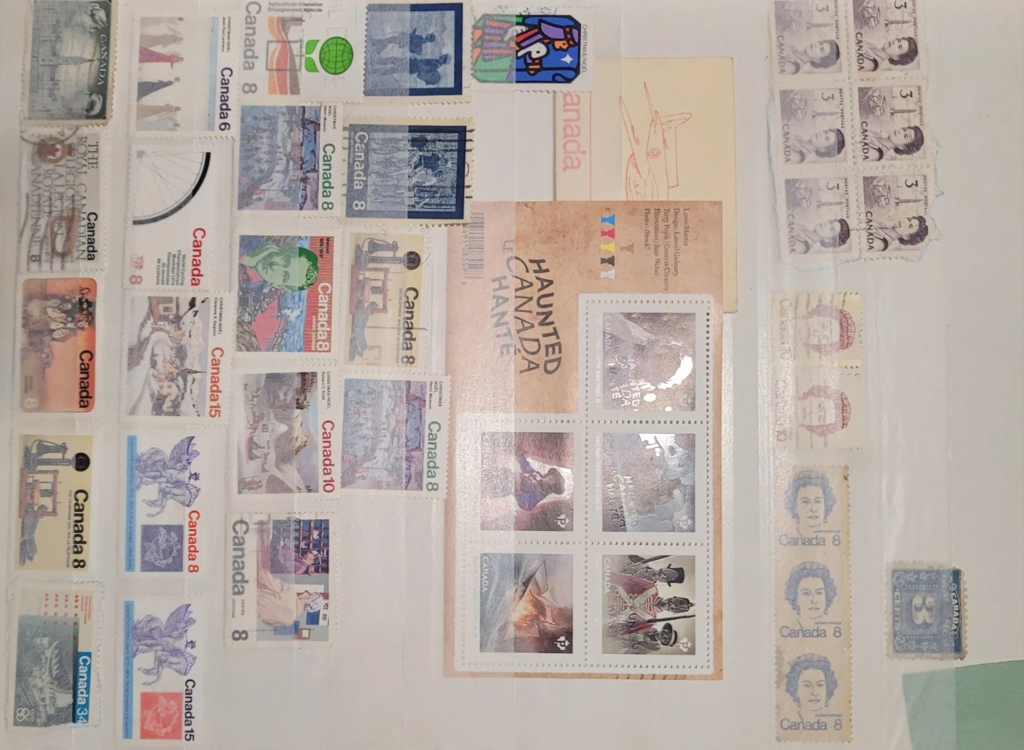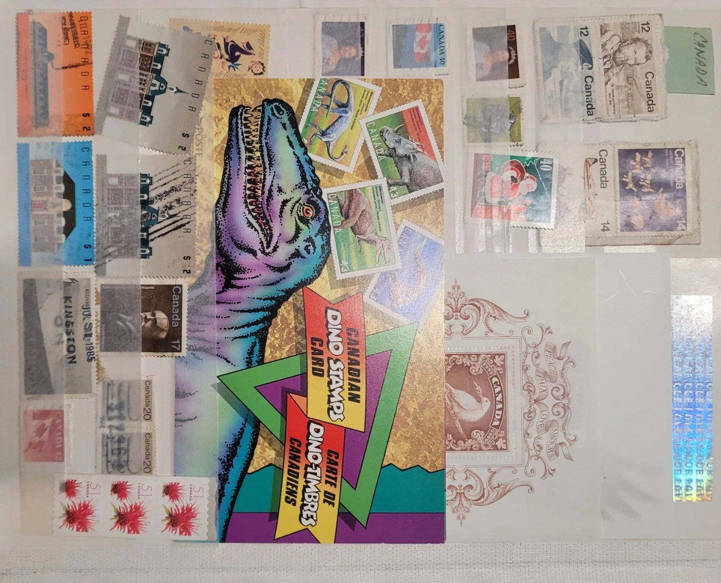 This album contains a variety of Canadian postage stamps, including historical figures, wildlife, and special editions like the 'Canadian Dino Stamps' and 'Original Six' hockey player series. It also includes stamp collectibles featuring Canadian goalies and a 'Haunted Canada' set. A 'Lakefield, Ontario Photo Stamps' sheet is also present. Message for pricing 9n individual stamps or for a package deal