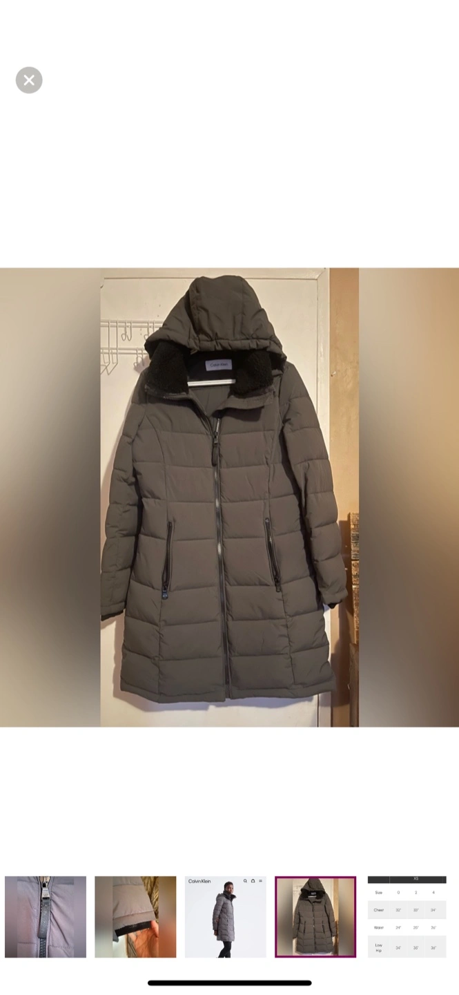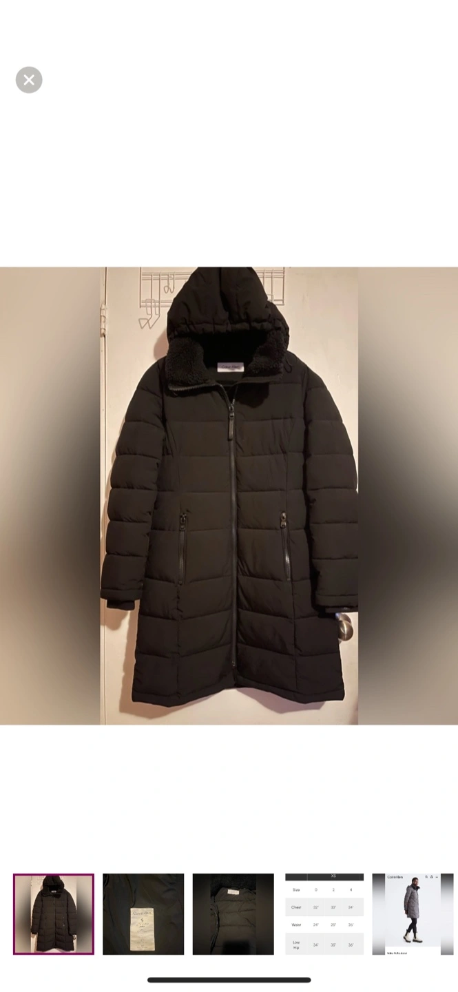 Black puffer jacket. Size XS. Features a hood with sherpa lining and zip closure. Long length. Excellent condition.