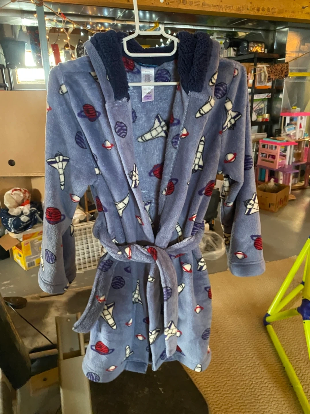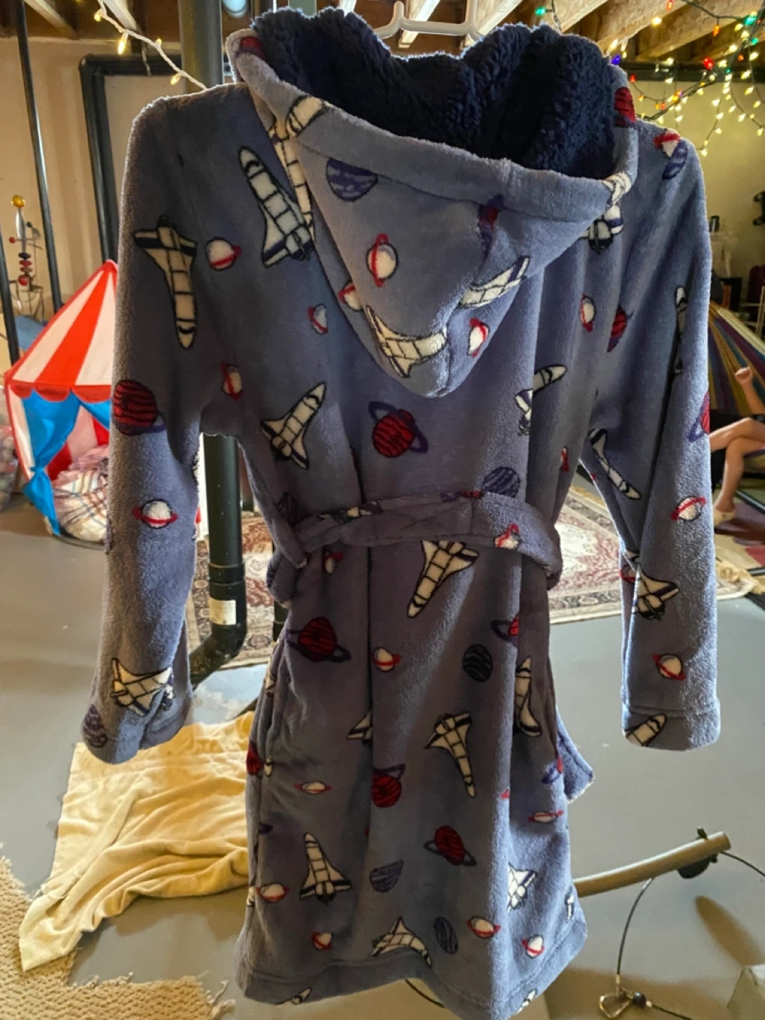 This fuzzy blue robe features a fun all-over print of space shuttles and planets. It has a cosy hood and a tie belt for a snug fit. Kids can wear this for lounging around or getting ready in the morning.