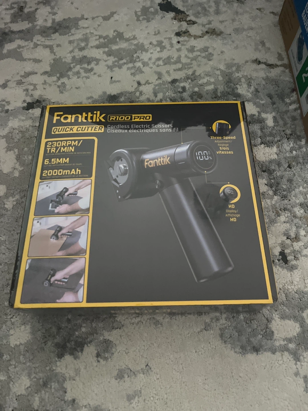 Fanttik R100 PRO cordless electric scissors with a 2000mAh battery. Cutting depth of 6.5mm (1/4 inch). Includes two blades and a charging cable.