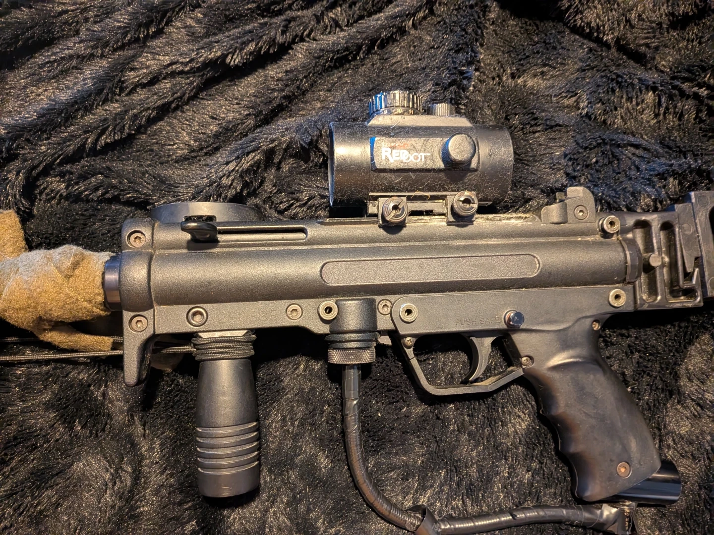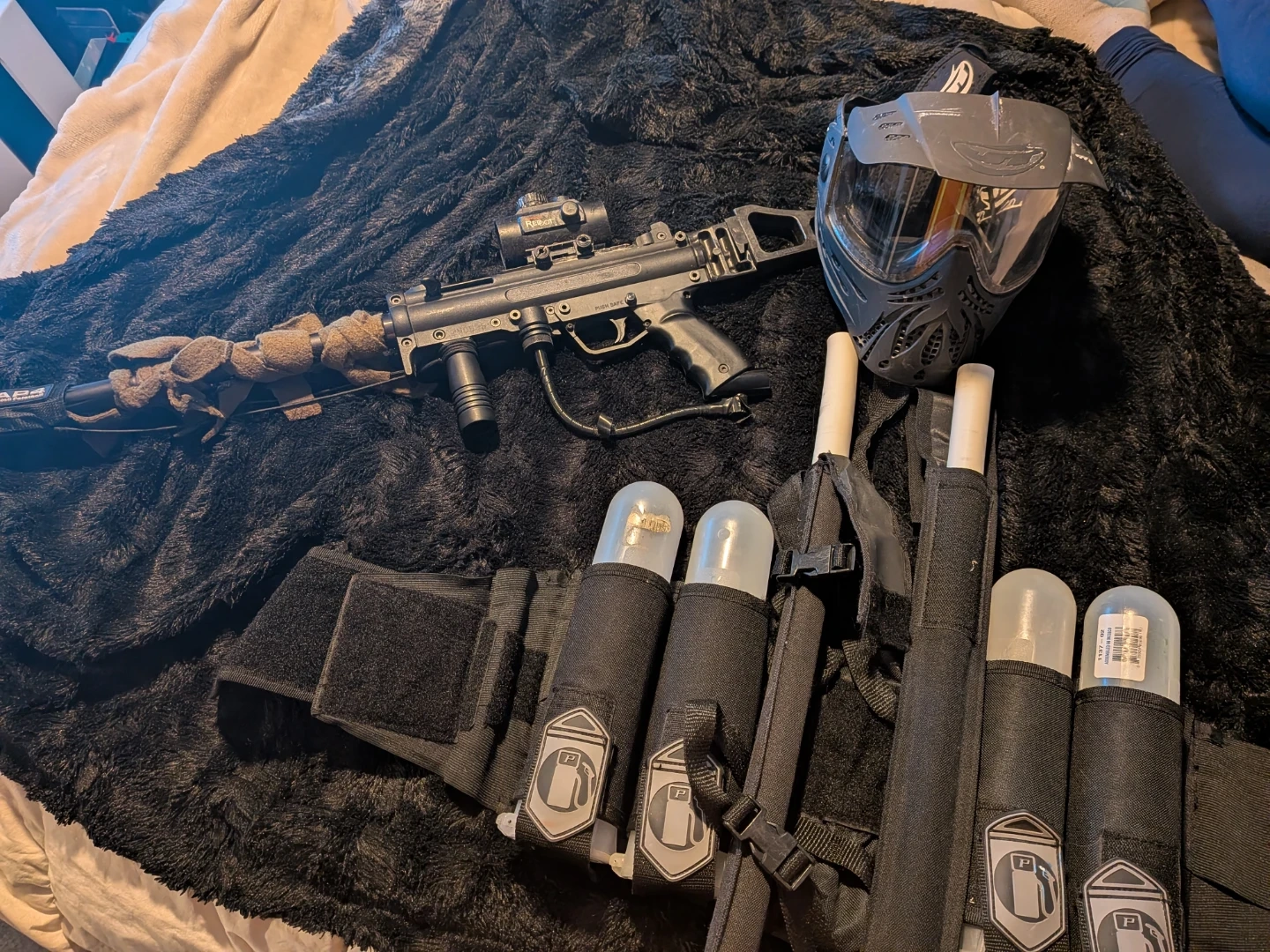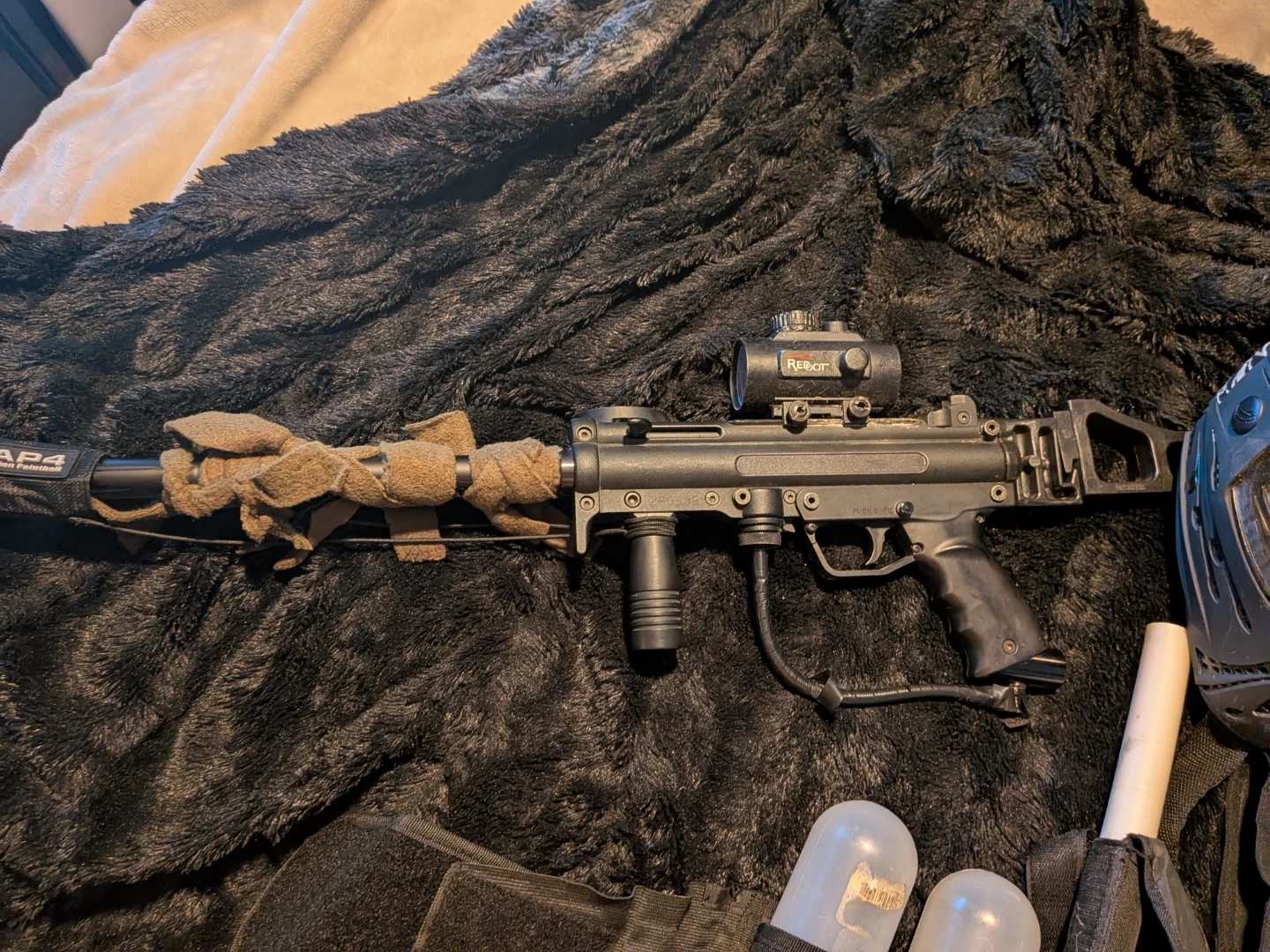 Selling a used tippman paintball gun with red dot sight that comes with a mask, hopper, several quick load canisters, and a folding stock, upgraded springs. Ready for C02 or nitrous. It's in good condition and ready for some action!