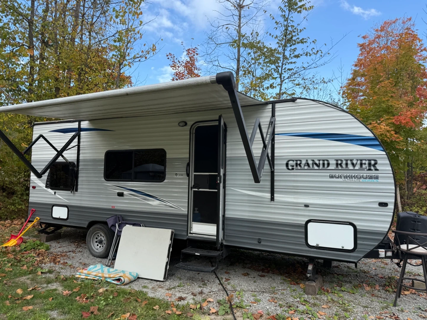 Clean Grand River Bunkhouse Ultra-Lite travel trailer. Has awning for shade. Bathroom has shower/tub combo and toilet. No outdoor kitchen , fridge is both electric or propane , length is 26.7 feet and weight is 3700 lbs