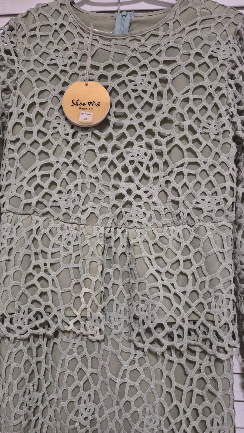 This is a women's dress from Show me Fashion. It's a size 38 with a unique all-over cutout design. Perfect for a special occasion or elegant event!