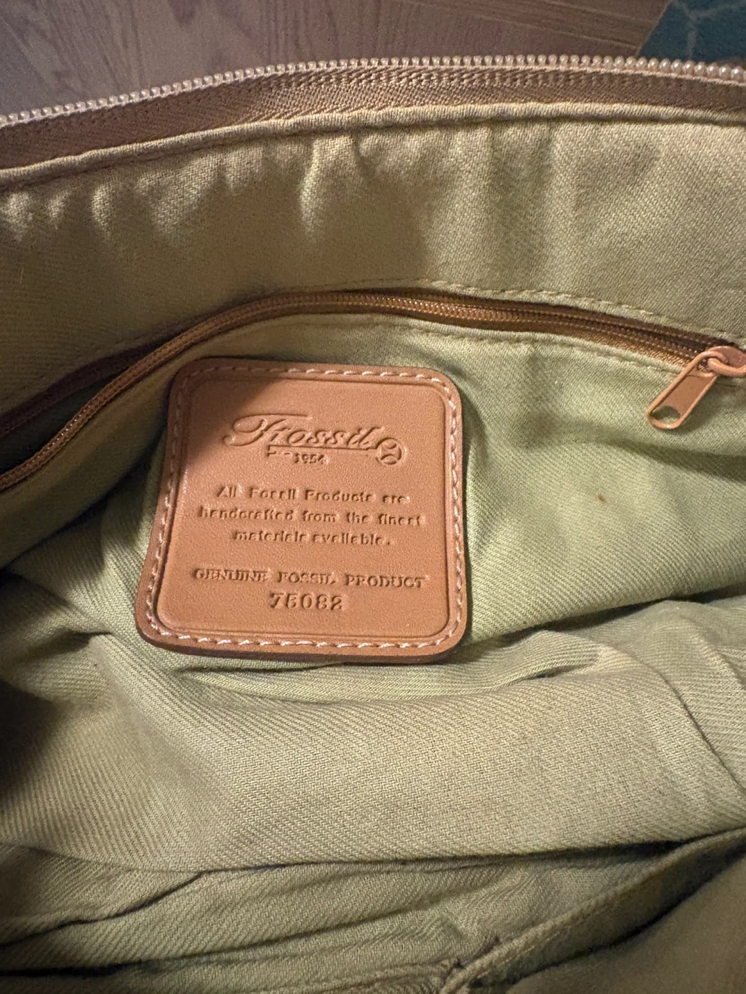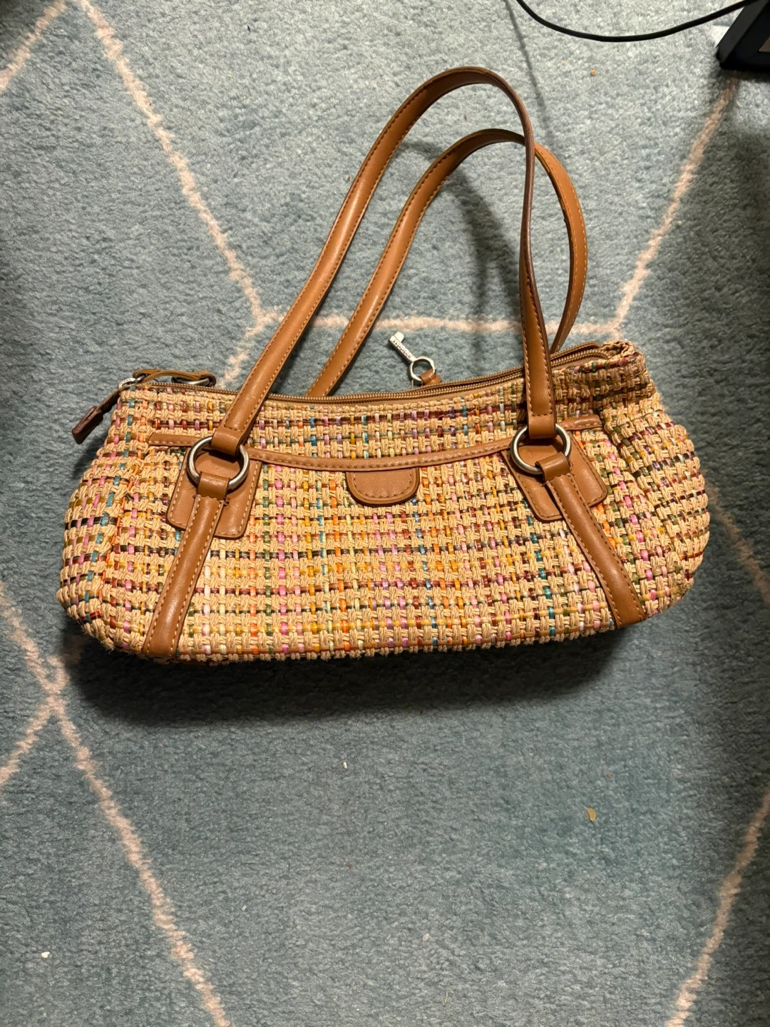 This Fossil satchel purse features a woven exterior with leather accents. The interior is lined with fabric and includes a brand tag. It's a stylish accessory for everyday use!