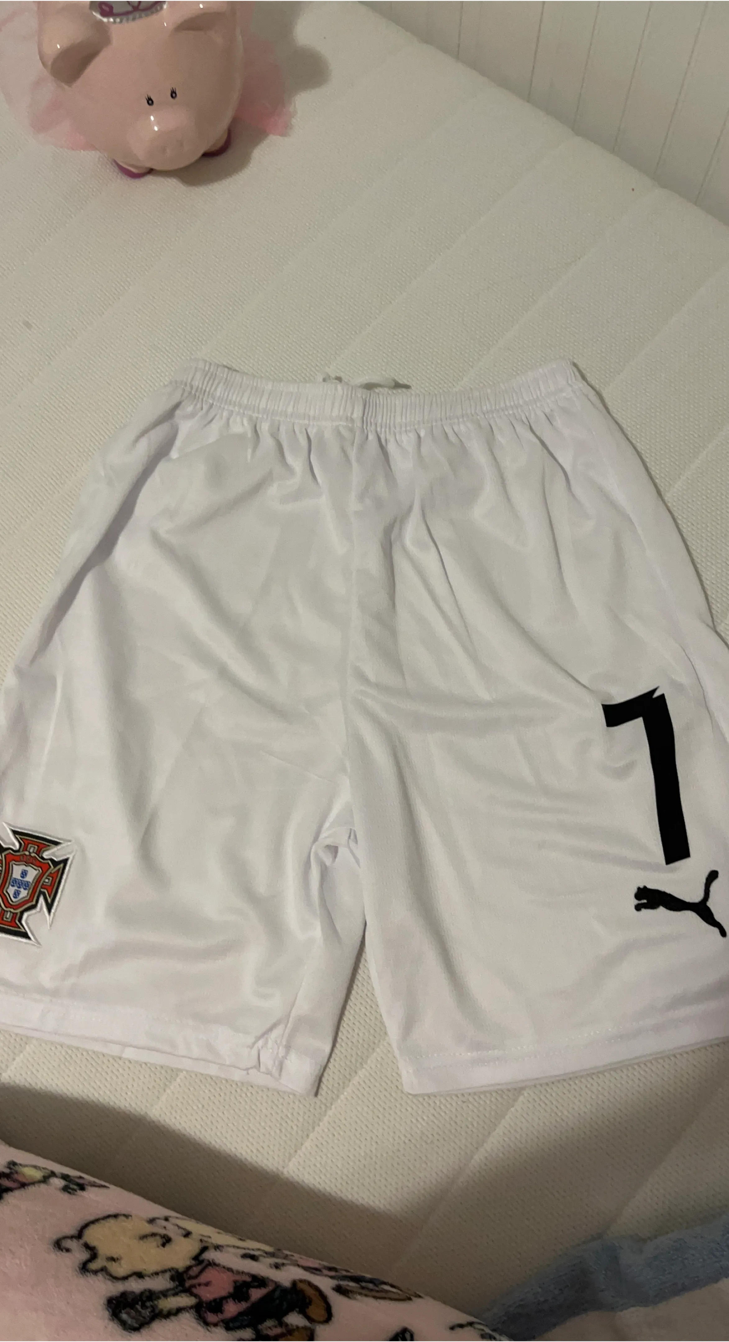 White Puma soccer shorts with the Portugal crest and the Cristiano Ronaldo’s number 7. Polyester material. Elastic waistband with drawstring. Unisex Kids size Large