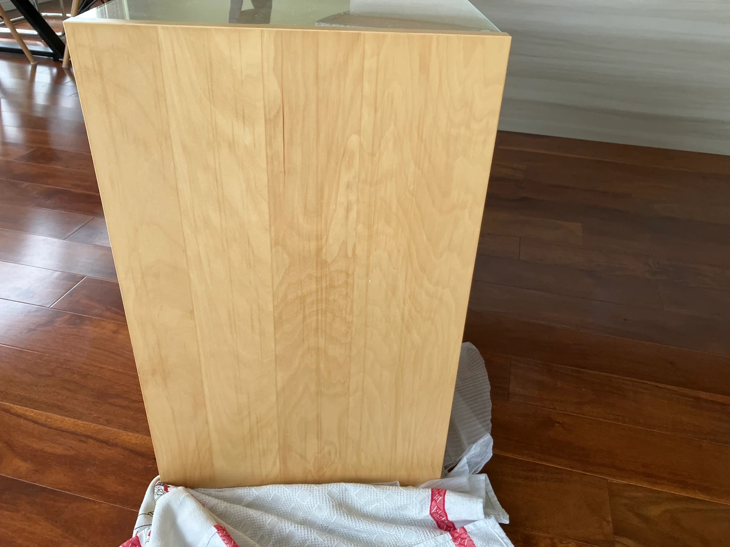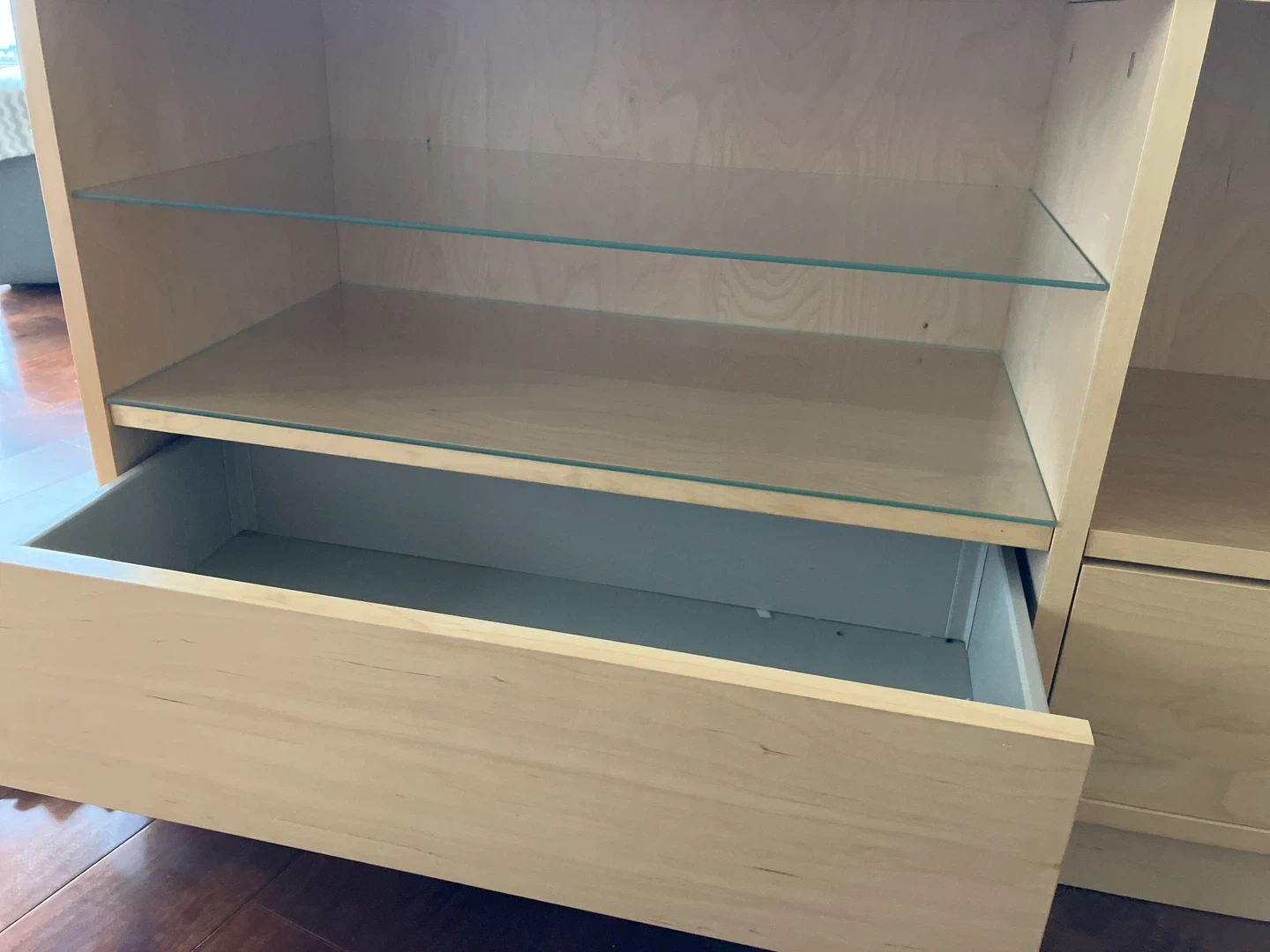 Selling a light wood TV stand! It has two drawers and glass shelves, great for storing media or displaying decor. It's in great condition and ready for a new home entertainment setup.