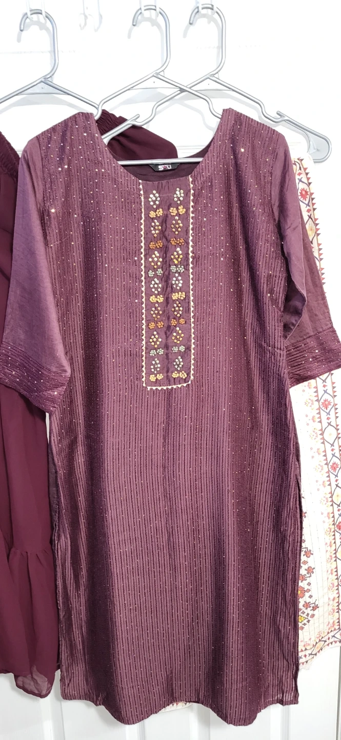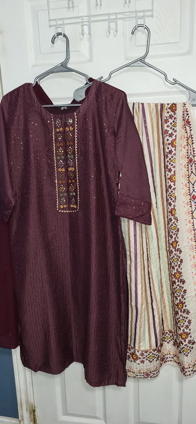 Selling a beautiful Maroon/Brown dress with intricate embroidery and Sharara. It's a size XL and comes with a matching dupatta. The beauty of dupatta is eye catching, you will steal the all attentions around you. Perfect for a special occasion!(Worn Only Twice)