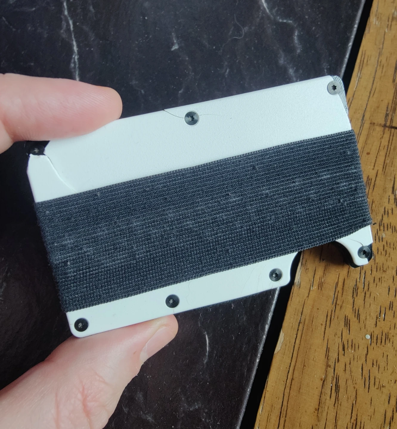 Selling a genuine Ridge Wallet in white. This is a slim, RFID-blocking wallet that still works, but has noticeable cosmetic damage (see photos).