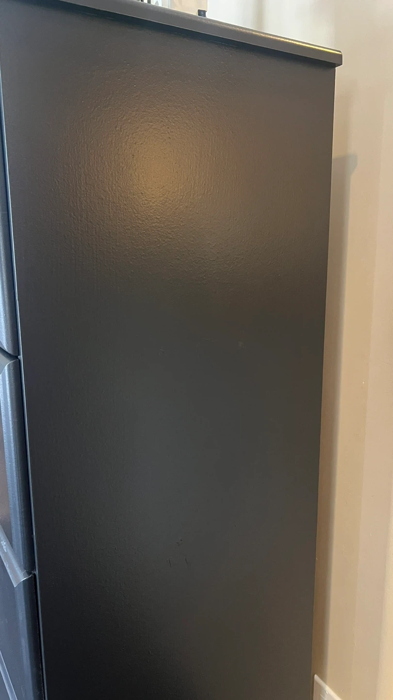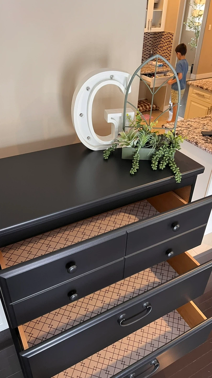 This black dresser has six drawers for ample storage. The drawers are lined with a decorative geometric pattern. It's a great piece for organizing clothes or other household items.