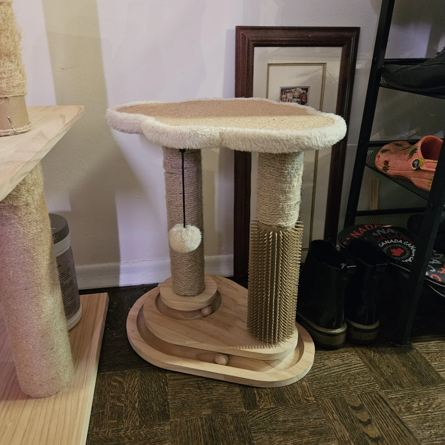 Here's a cute cat tree with a scratching post! It's in great shape and ready for a new feline friend. This cat tree features a soft, cloud-shaped top for lounging and a sisal-wrapped post for scratching. The base is made of wood and includes a fun track for your cat to play with