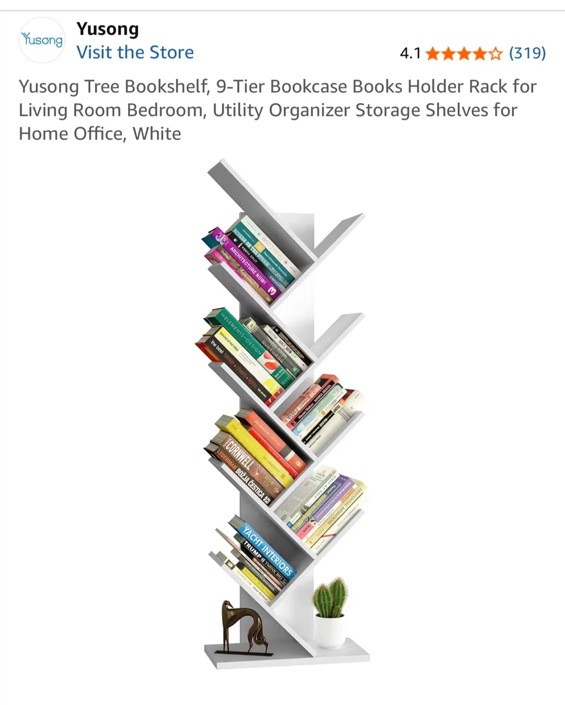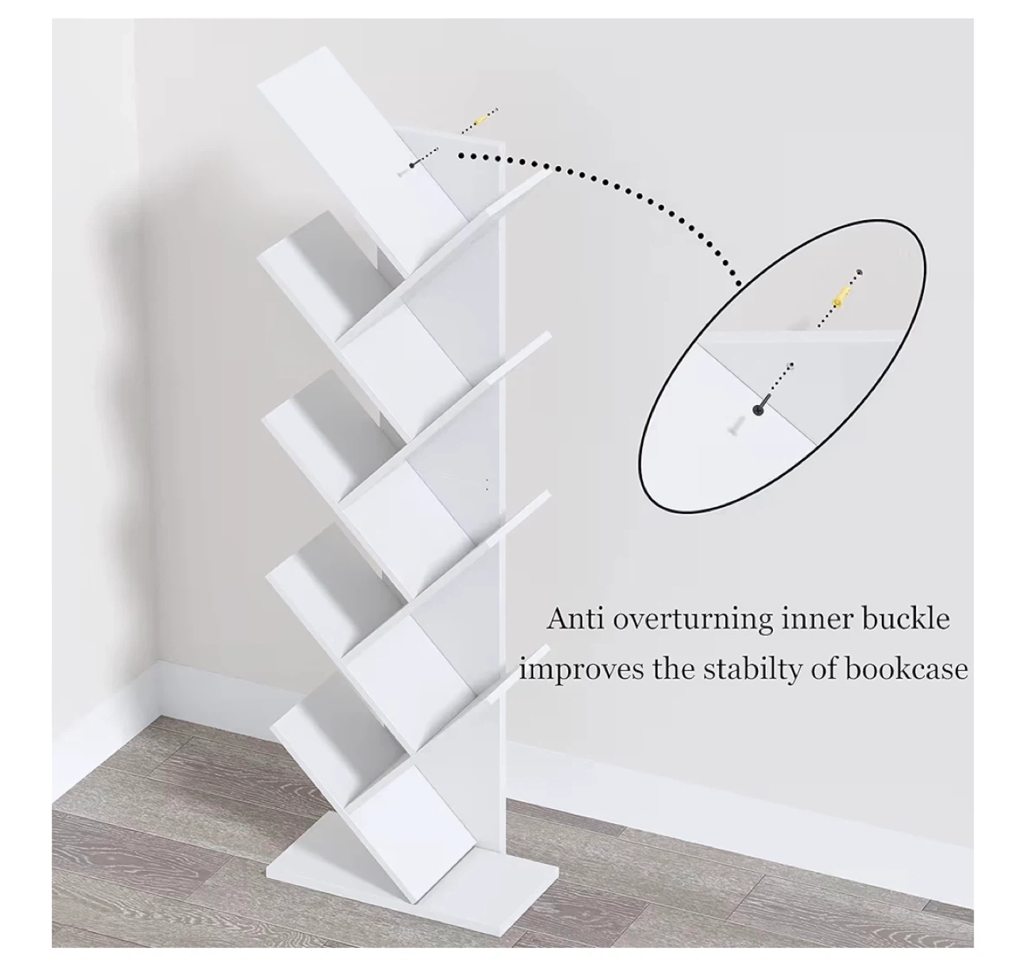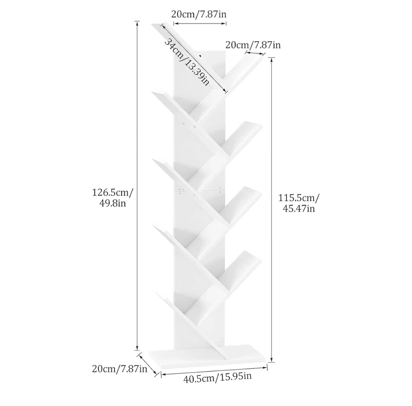 This white tree bookshelf has a unique design with 9 tiers for book storage. It includes an anti-overturning buckle for improved stability. Dimensions: 115.5cm H x 40.5cm W x 20cm D.