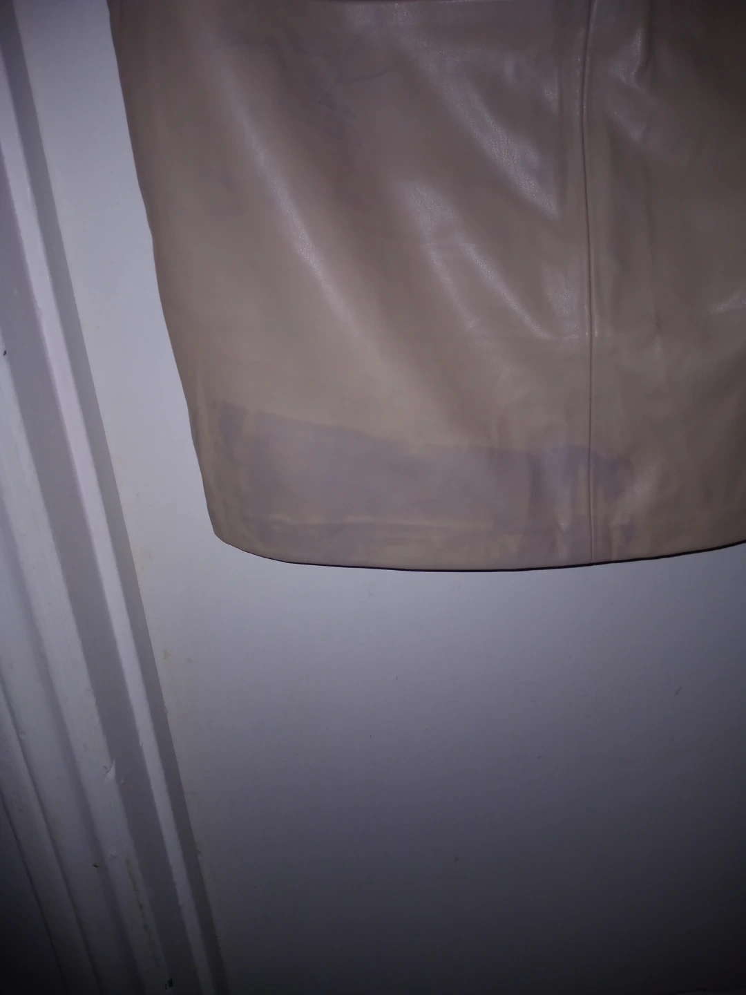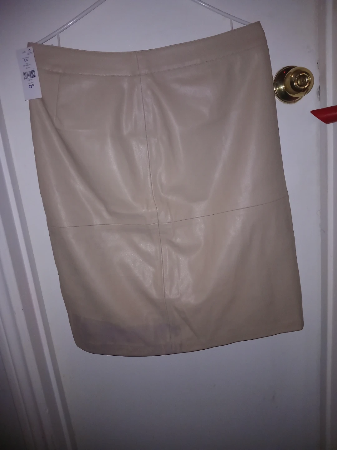 This is a faux leather pencil skirt. It's a size L/G. The colour is beige and has a blue stain from being stored away as seen brand new asking $5