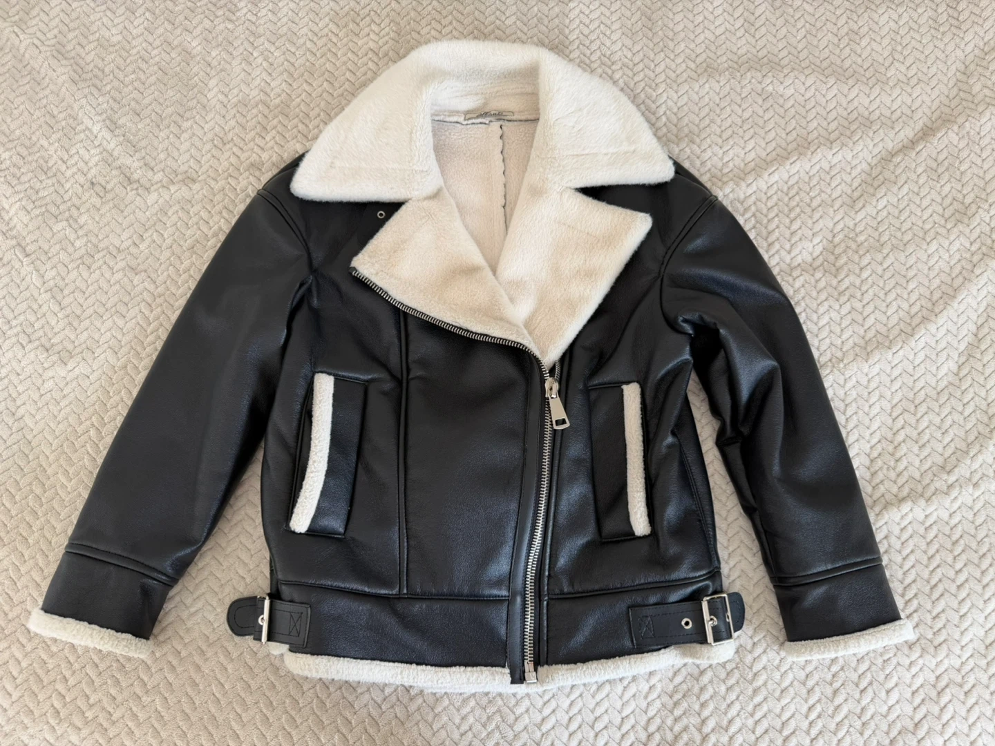 It has a zipper closure and buckle details at the hem. This jacket's perfect for keeping warm on cooler days!