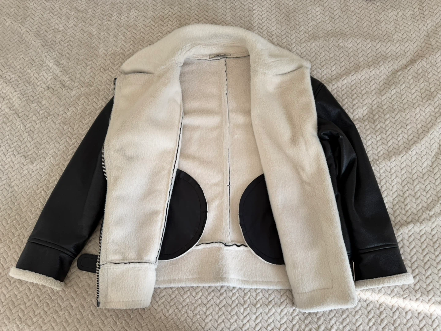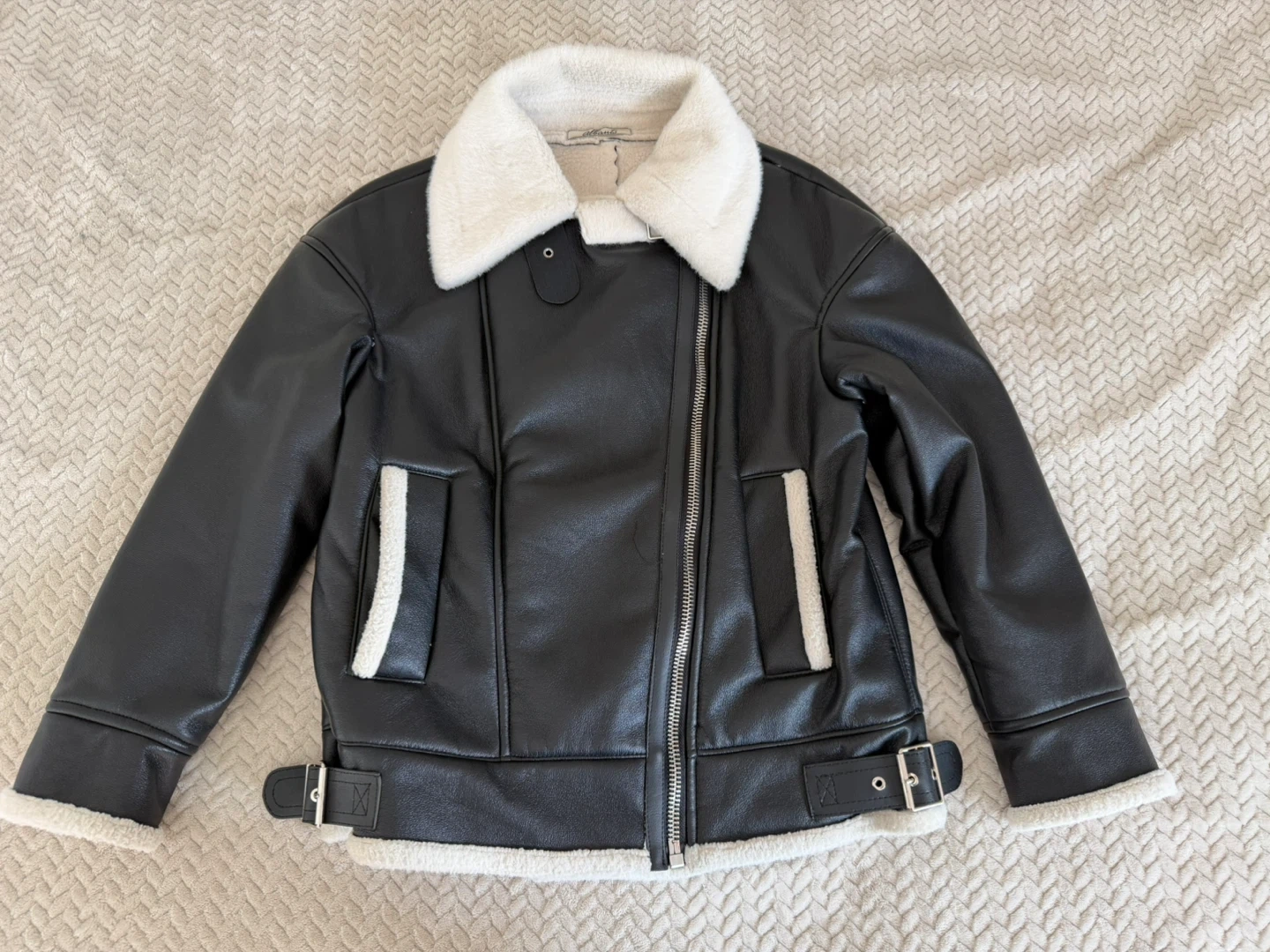 It has a zipper closure and buckle details at the hem. This jacket's perfect for keeping warm on cooler days!