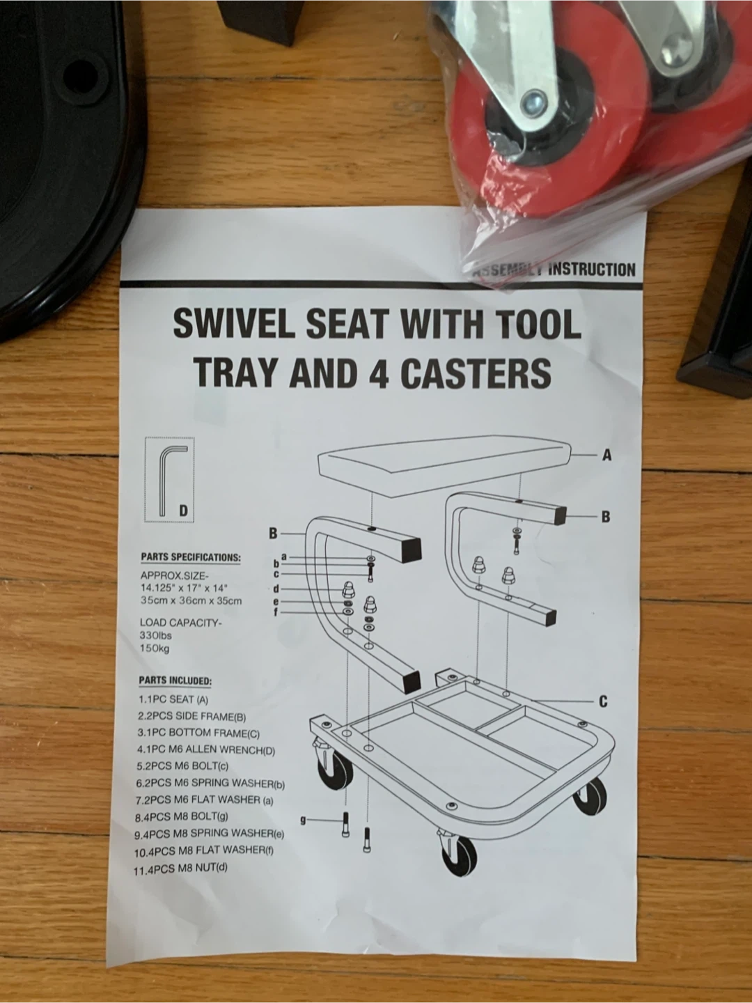 This swivel seat includes a handy tool tray and four smooth-rolling casters for easy movement. It has a load capacity of 330lbs. The approximate seat size is 14" x 12" x 14" (35cm x 30cm x 35cm).