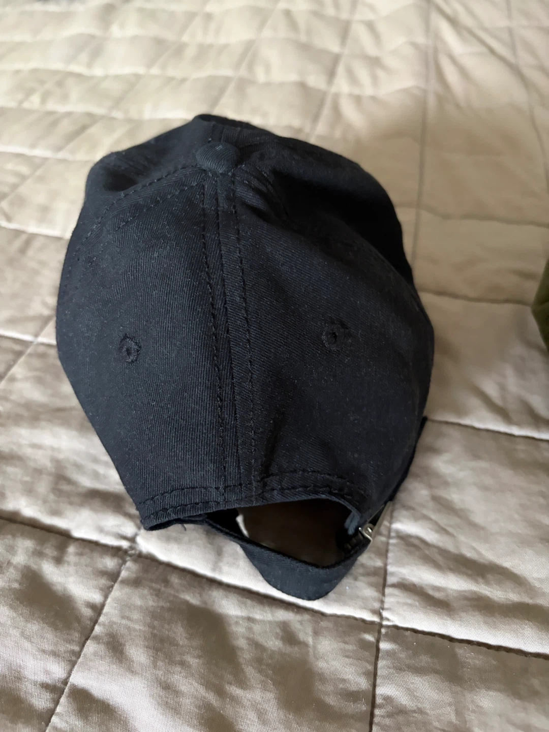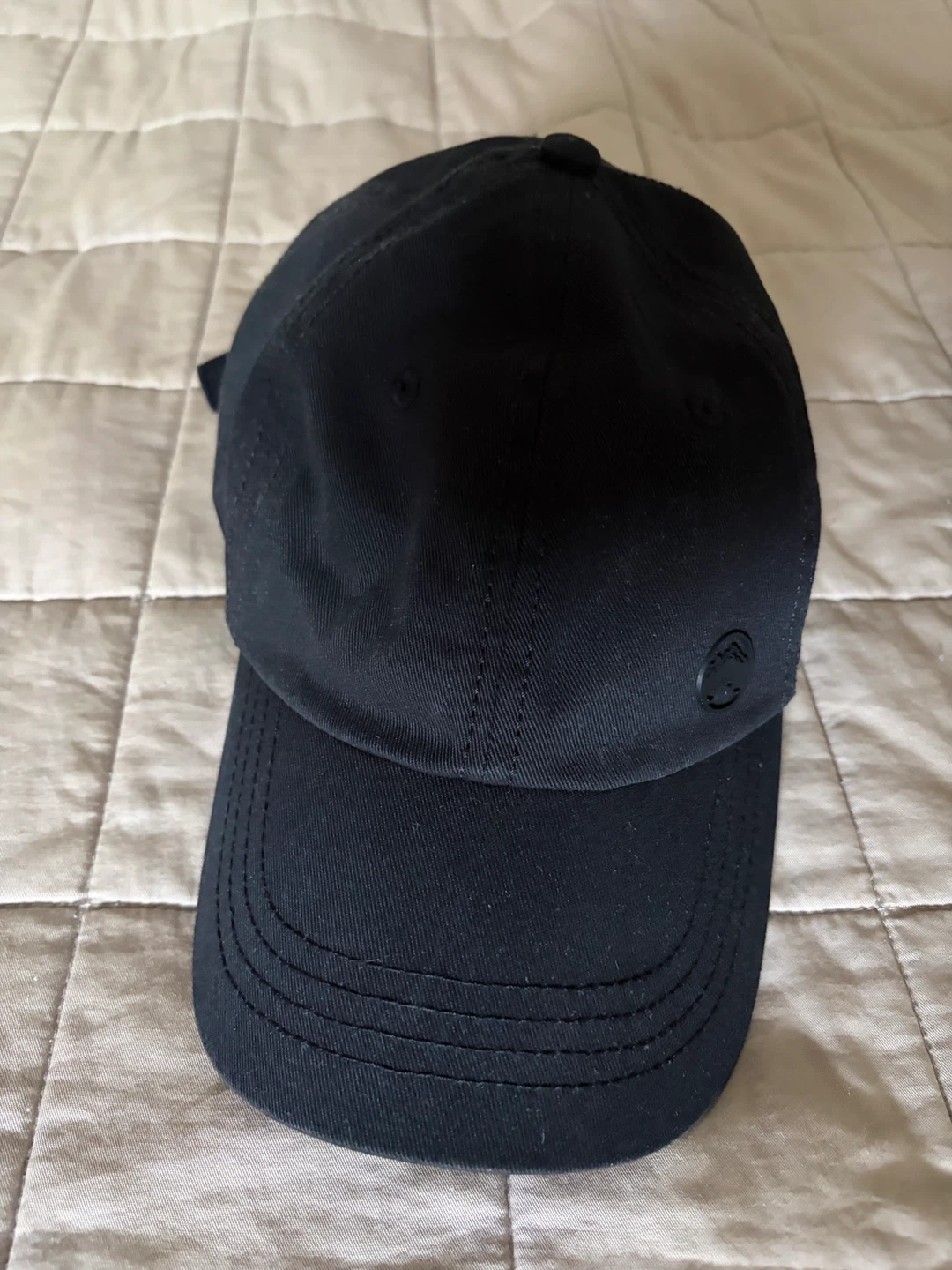 A classic black baseball cap. It's made of cotton with an adjustable strap at the back. This cap is suitable for everyday wear.