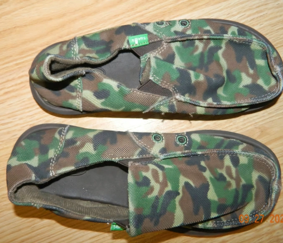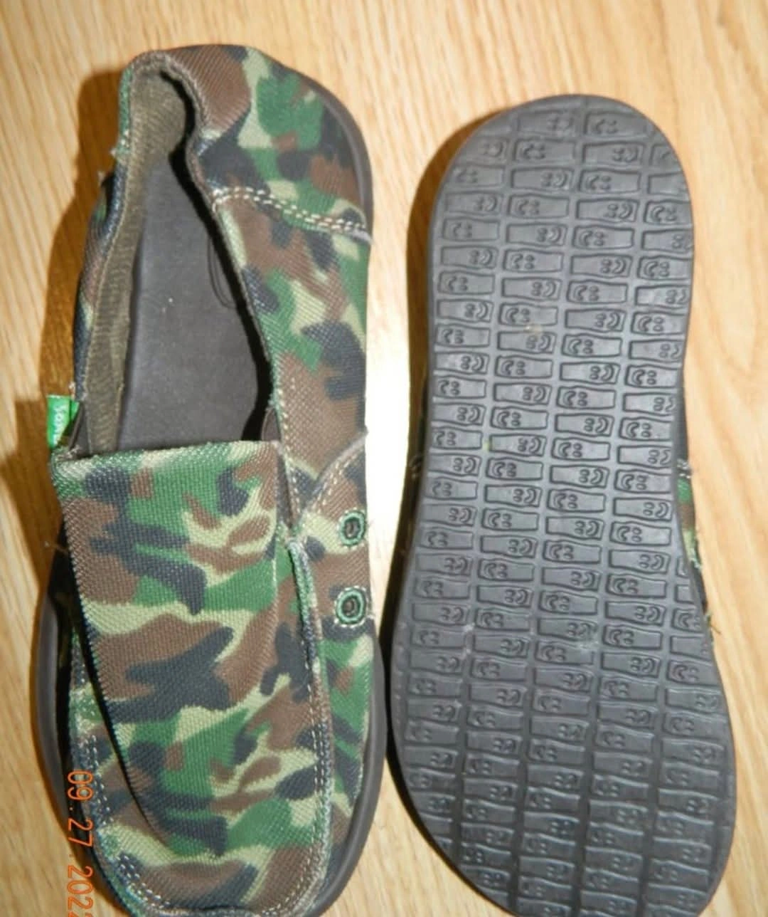 These are Sanuk slip-on shoes with a cool camouflage pattern! They're super comfy and great for casual wear. The rubber sole provides good traction, and the canvas material is durable. Perfect for adding a bit of style to your everyday look
