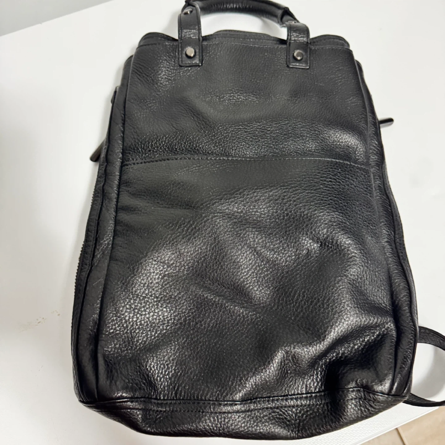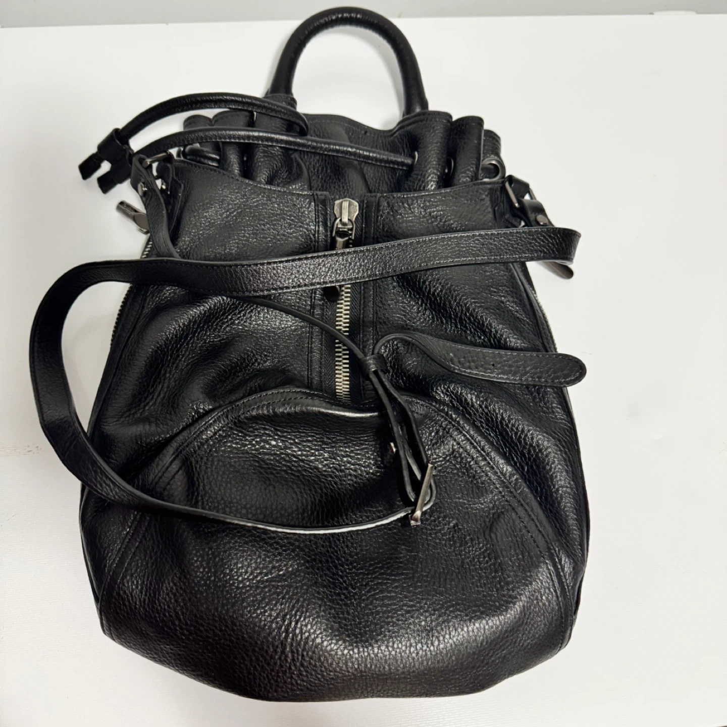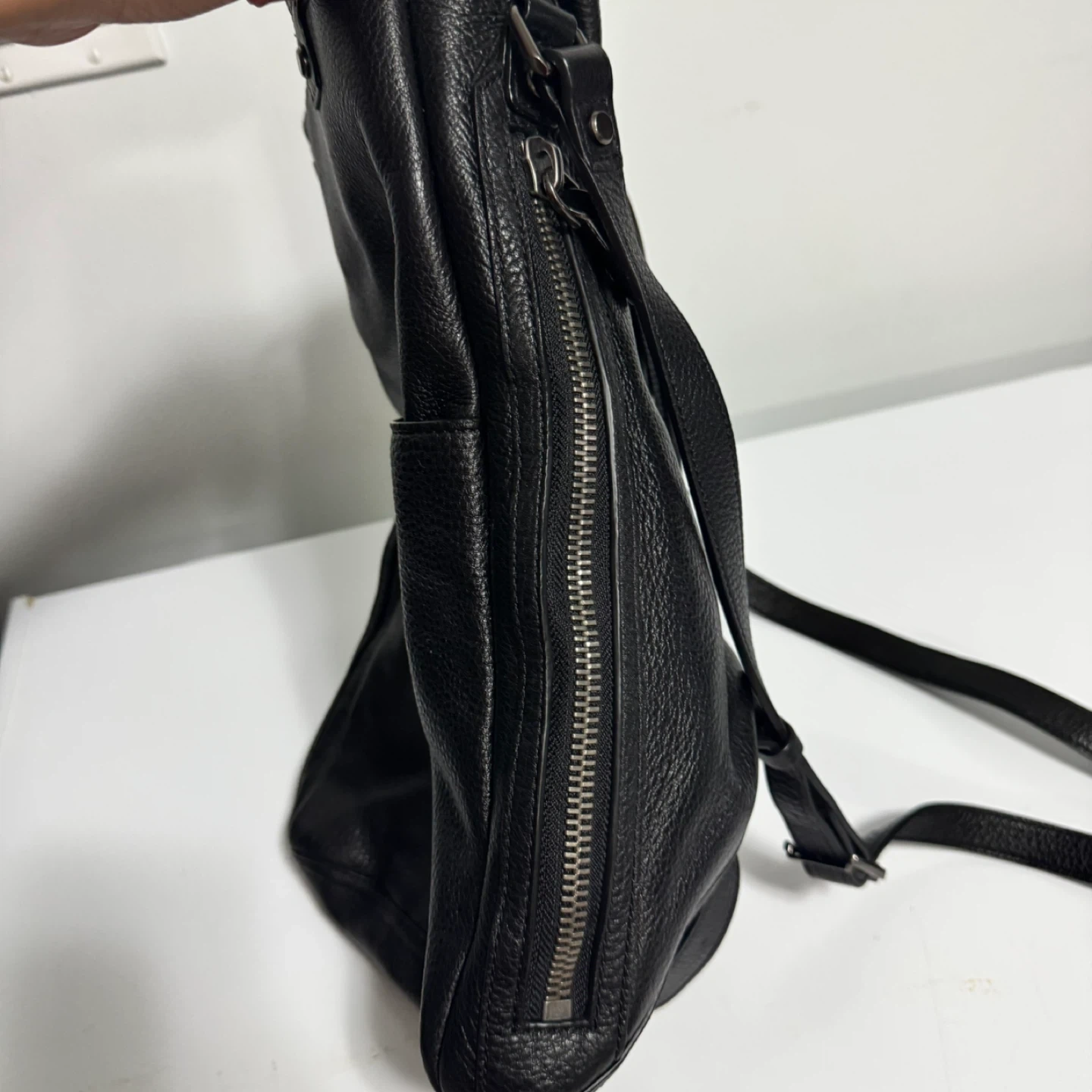 This is a Wilfred Free black leather bag. It features a drawstring closure and a zippered front pocket. The interior has a zippered compartment and is lined with fabric. Leather material.