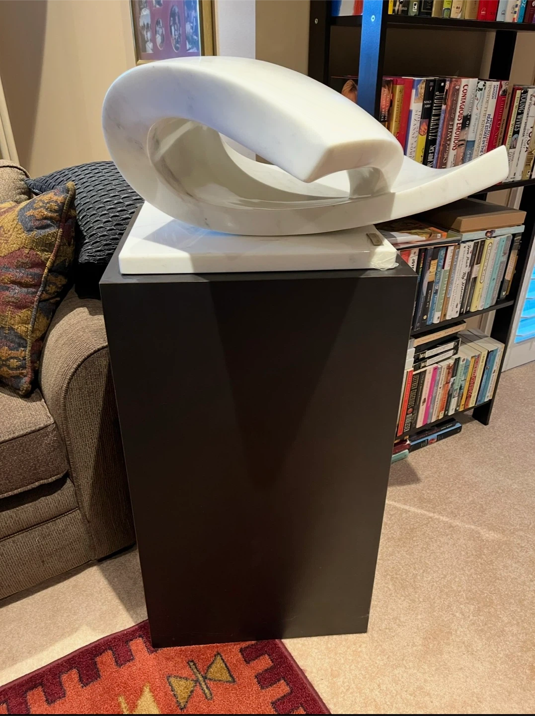 Selling a Petra Alexandra abstract sculpture. It features a white marble sculpture on a black pedestal. A unique art piece to add to your home!