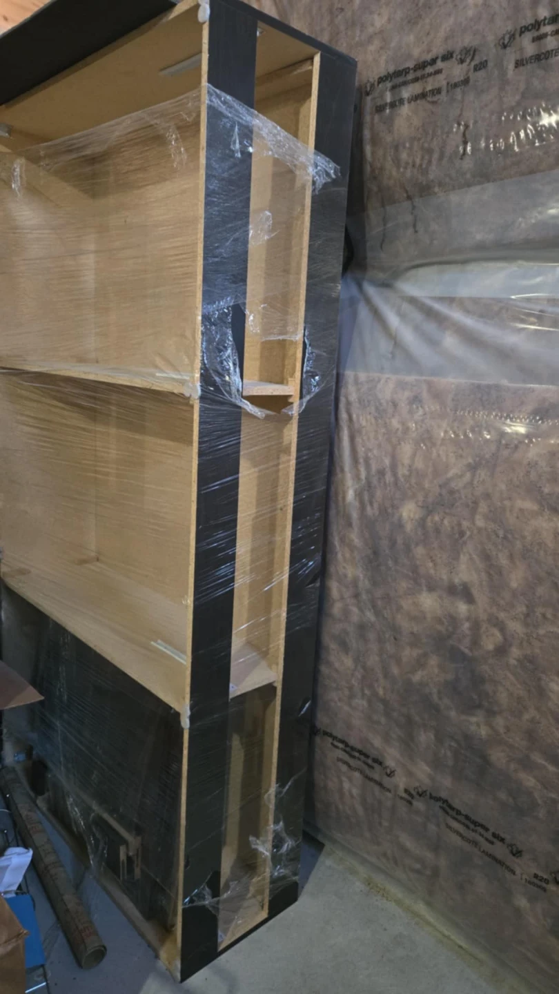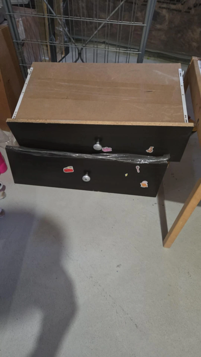 This is a three drawer Twin Bedframe. It's made of particleboard with a dark laminate finish. The unit is wrapped in plastic, indicating it's like a new or unused.