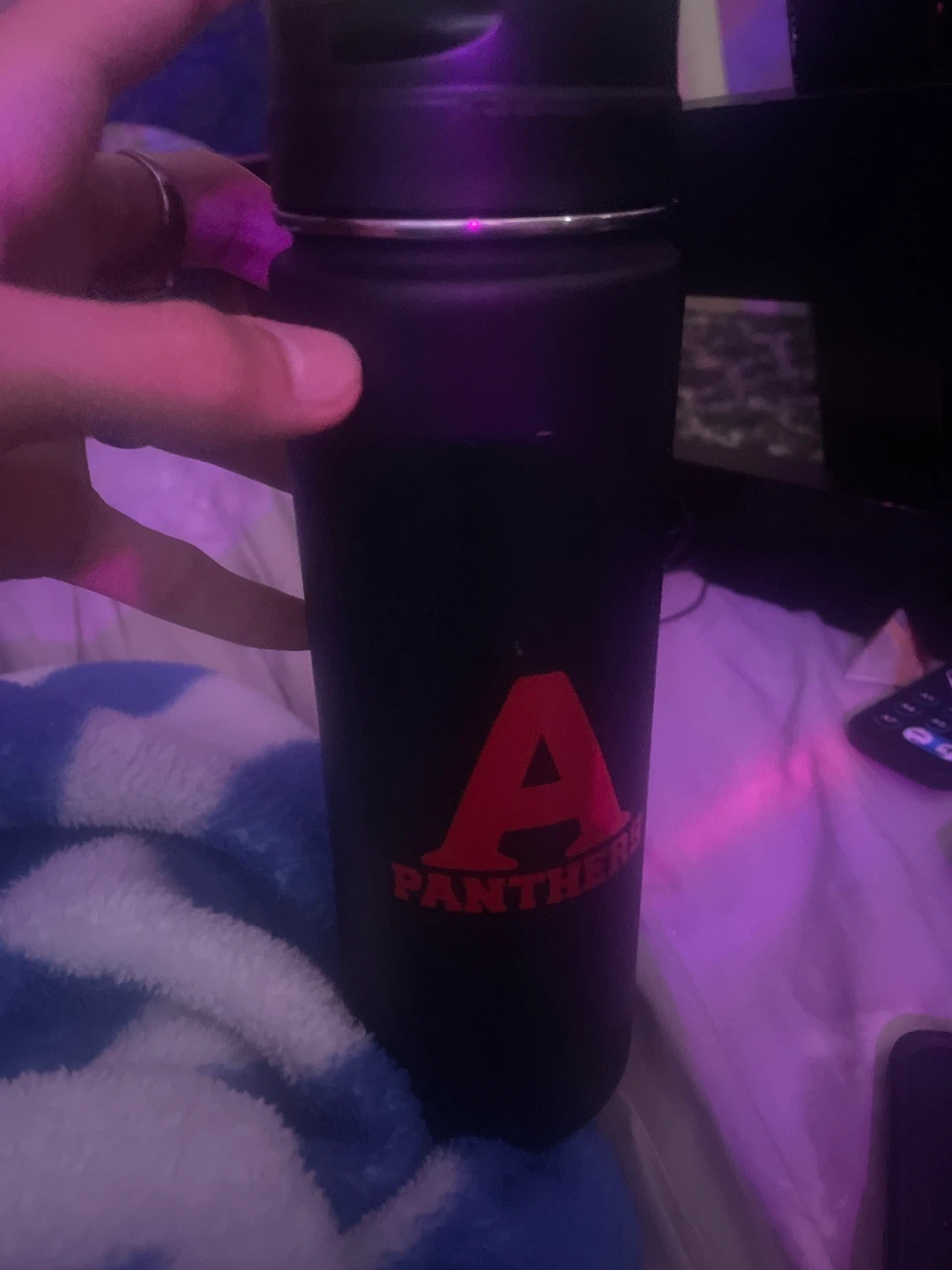 This black tumbler features a bold red 'A' Panther logo on it. It's a reusable cup designed for beverages. Great for taking drinks on the go!