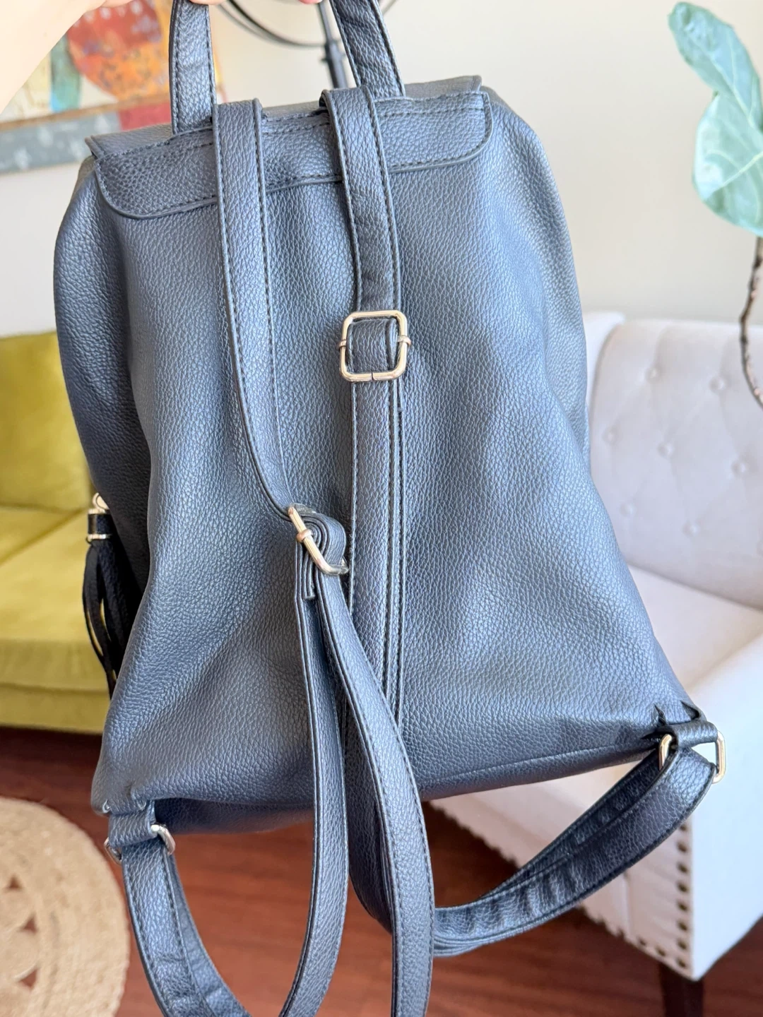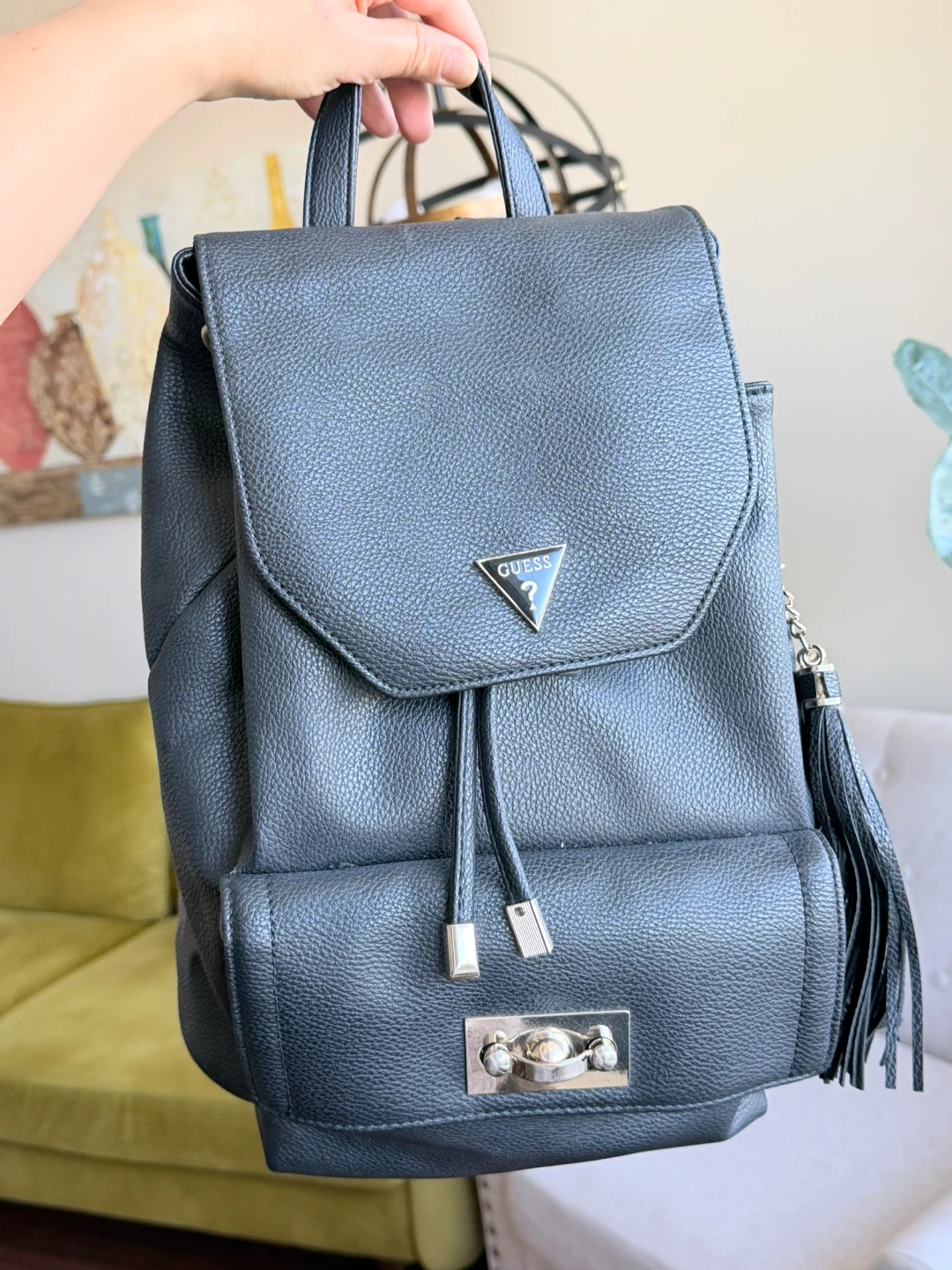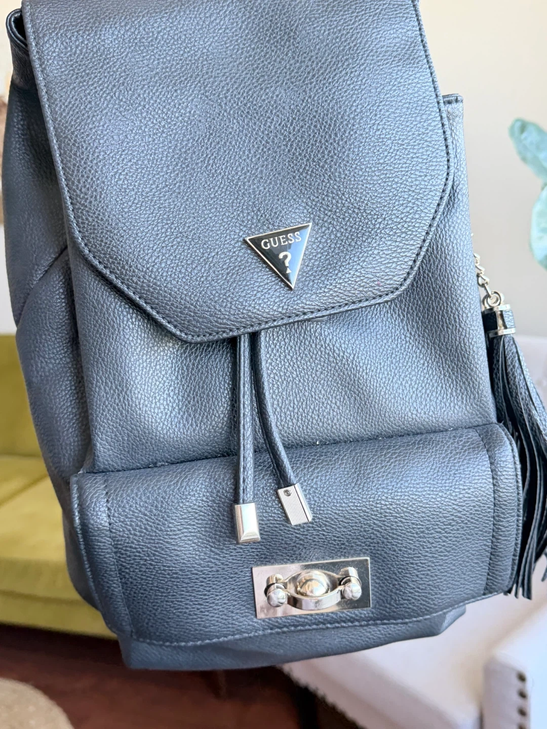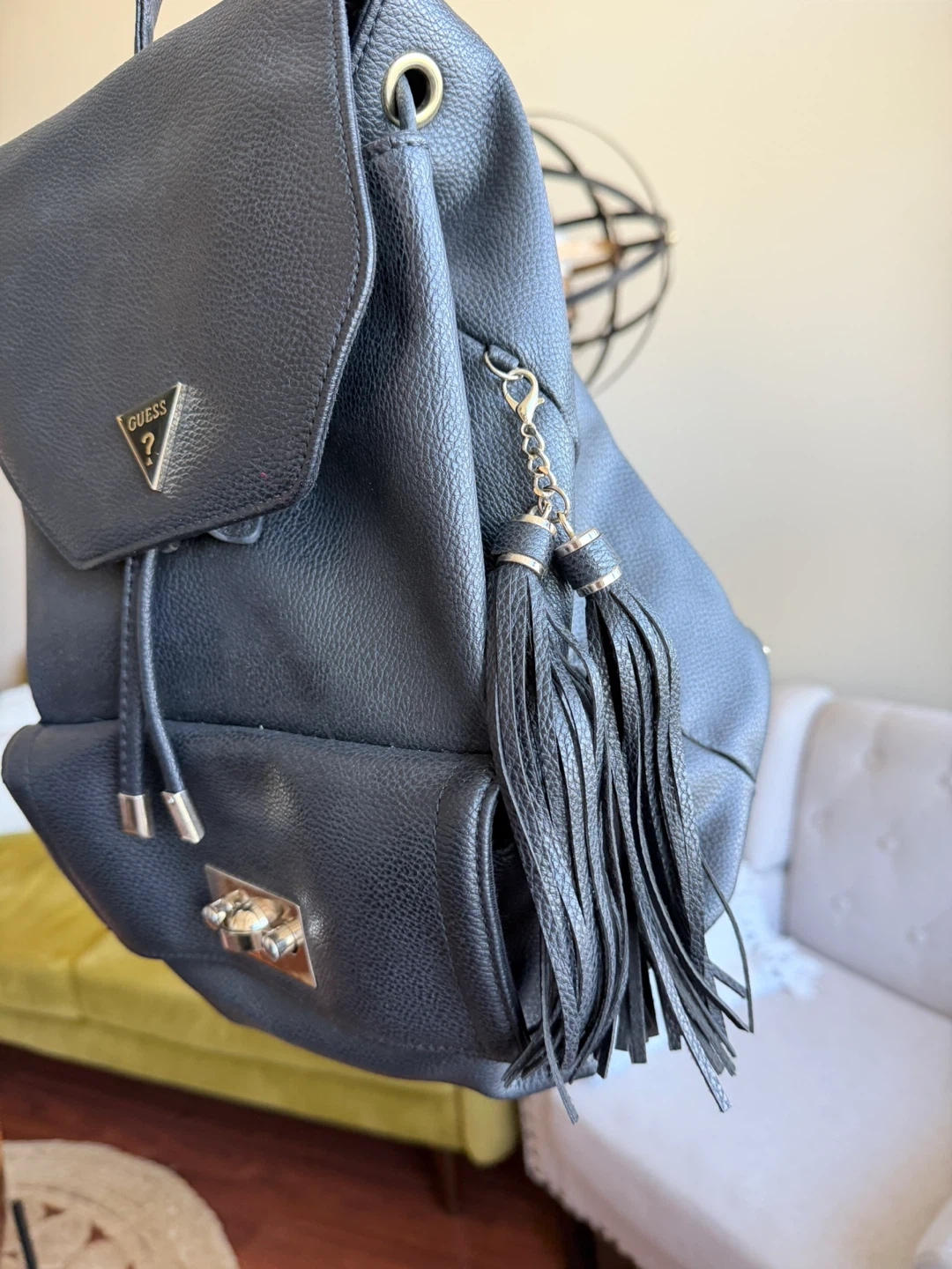 This is a black faux leather backpack from Guess. It features a drawstring closure and a metal clasp on the front pocket. The backpack has adjustable straps and decorative tassels.