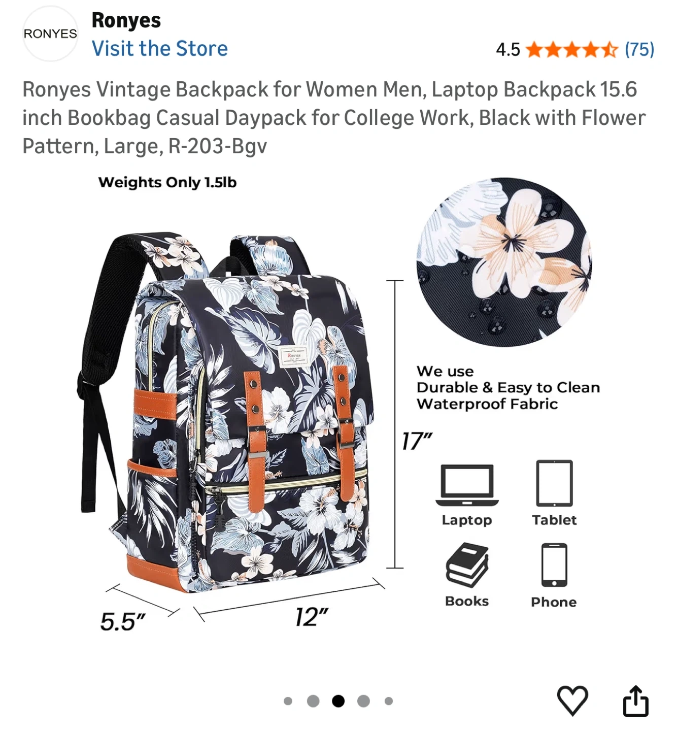 Ronyes Vintage Backpack for Women, Laptop Backpack 15.6 inch Bookbag Casual Daypack for Work, Black with Flower Pattern