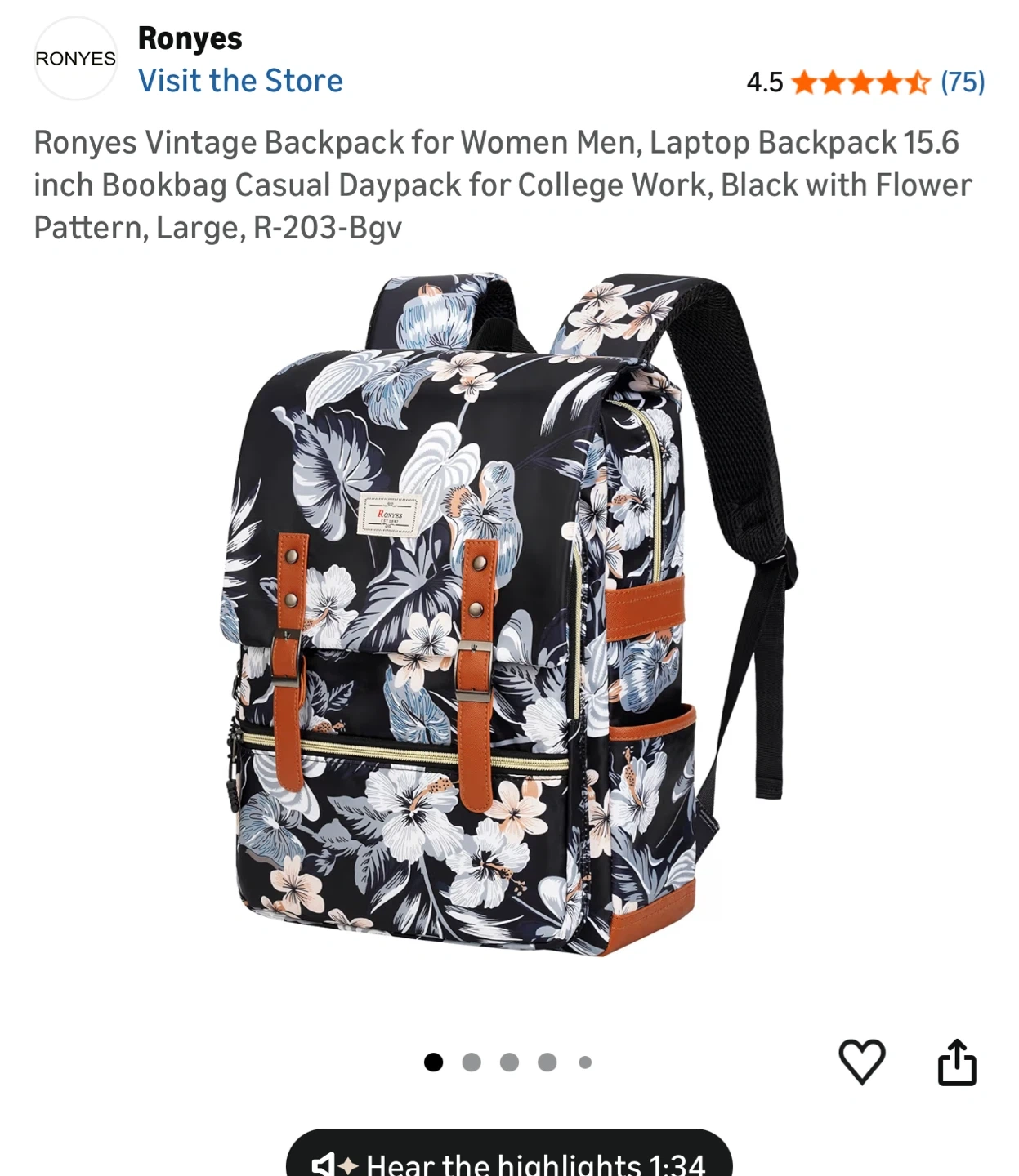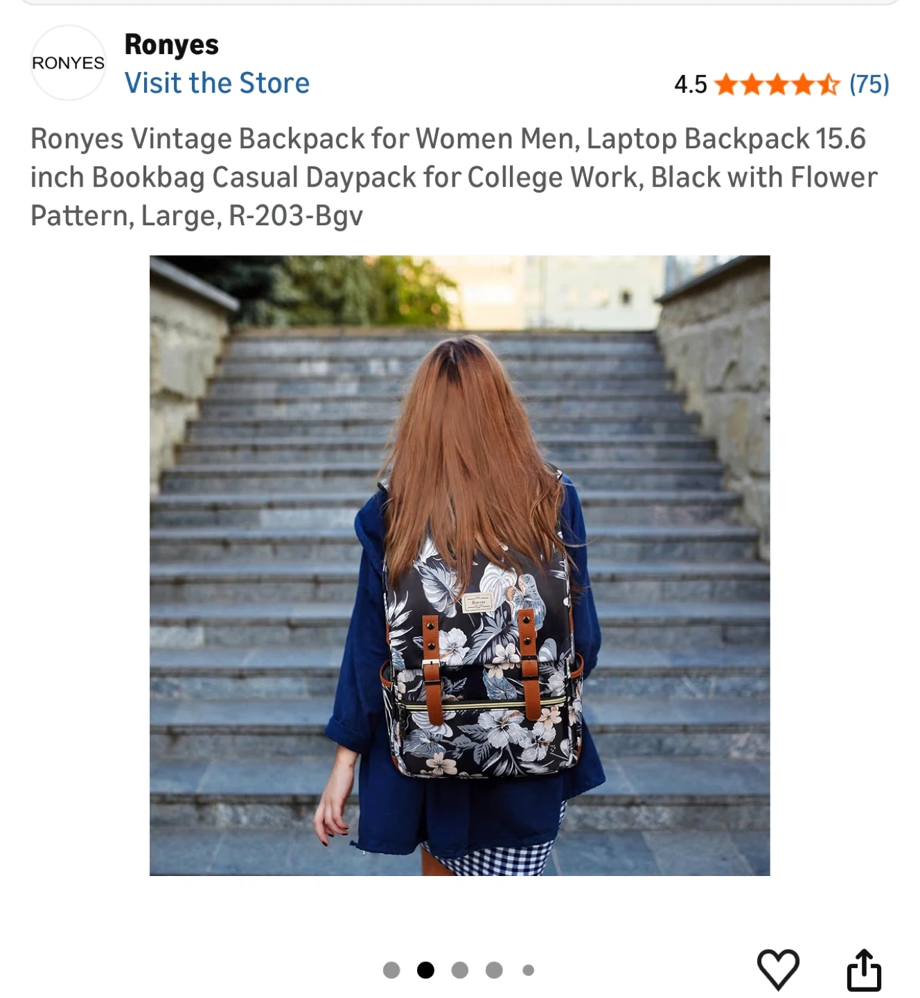 Ronyes Vintage Backpack for Women, Laptop Backpack 15.6 inch Bookbag Casual Daypack for Work, Black with Flower Pattern