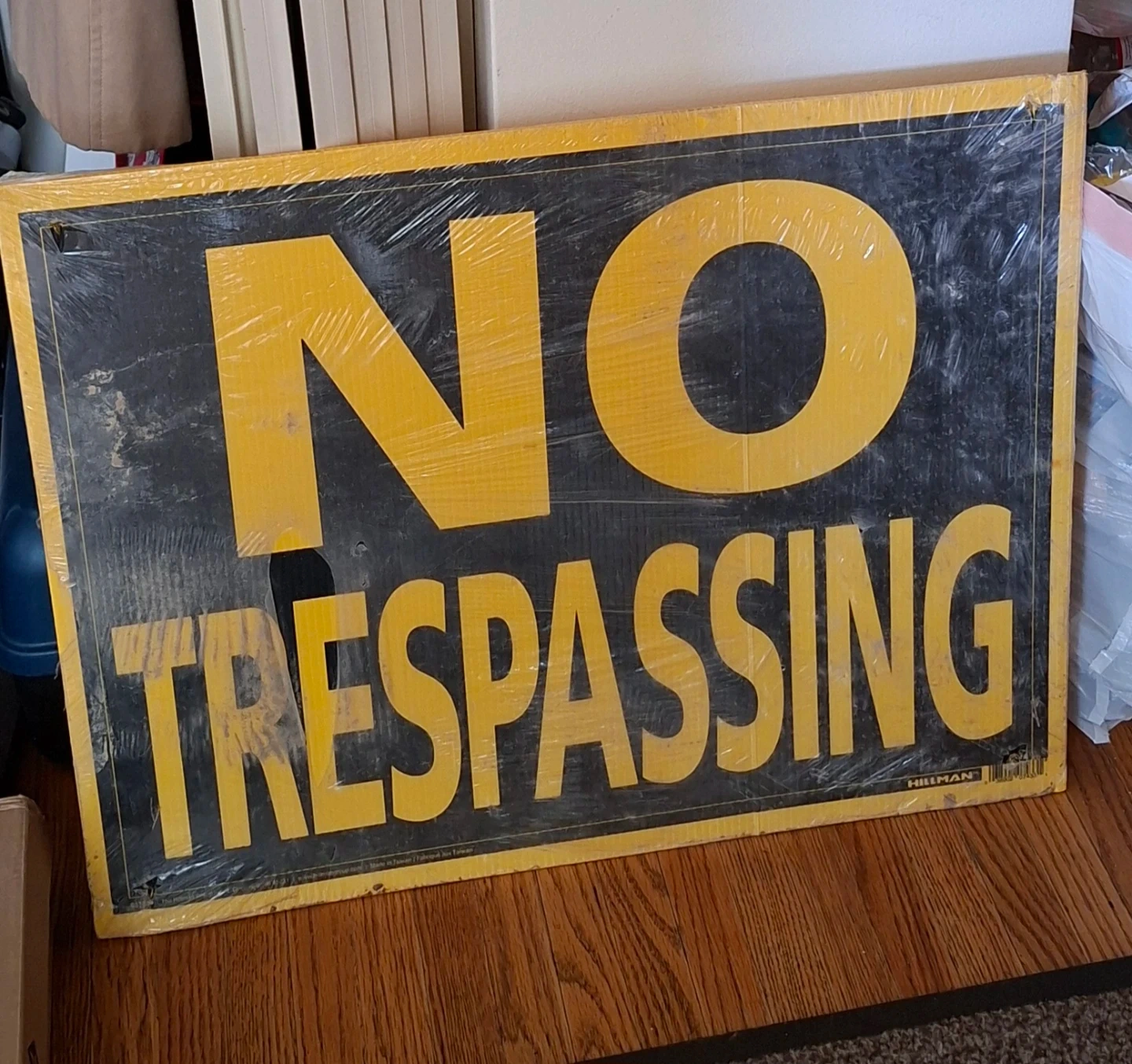 Any kids out there who may want this? This is a Hillman "No Trespassing" sign. It's black with large yellow lettering. The sign is protected by a clear plastic wrap.