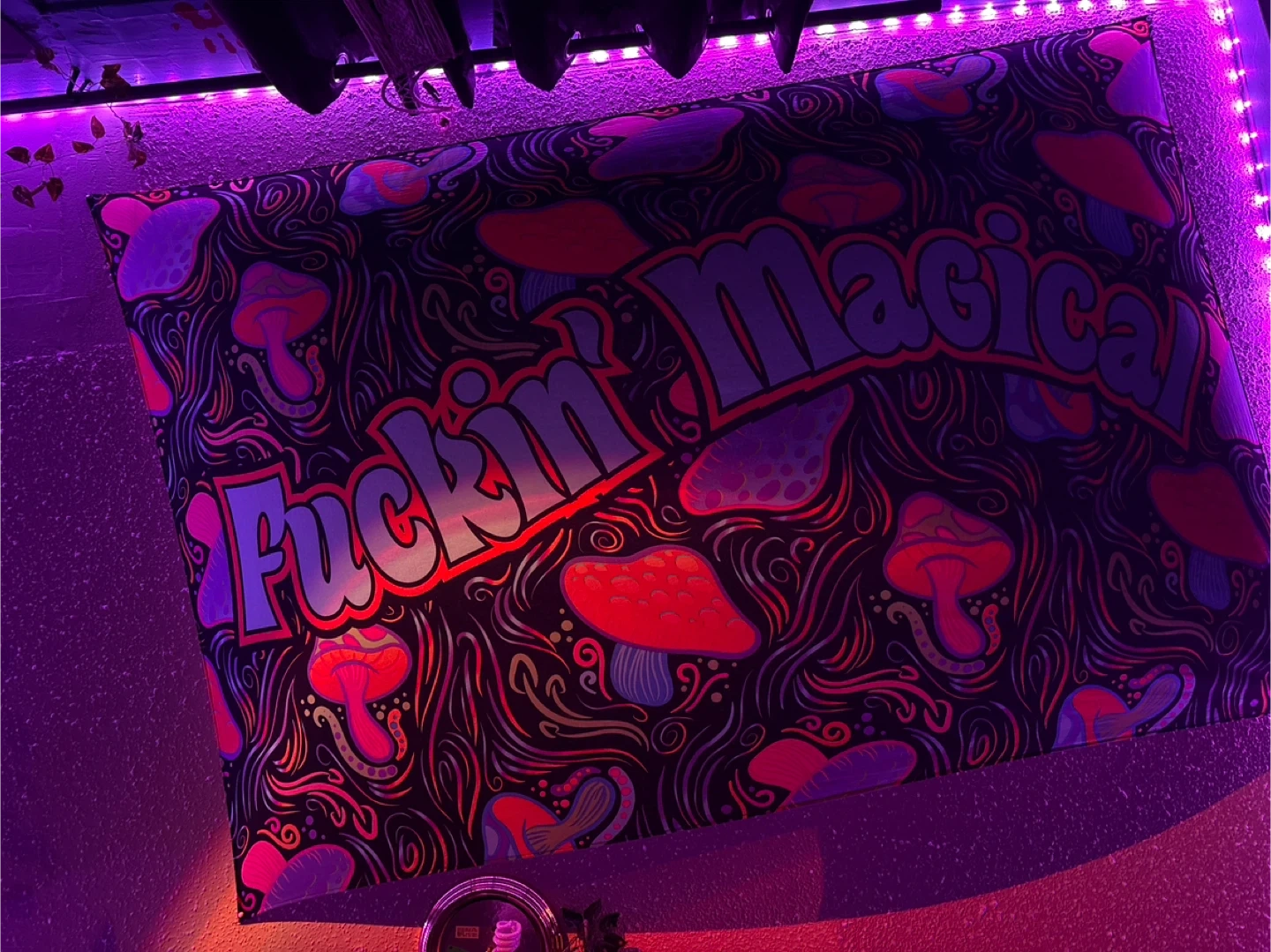 This is a tapestry with a 'Fuckin' Magical' design and mushroom art. It's a great piece for adding some funky vibes to your space. The fabric is lightweight and easy to hang.